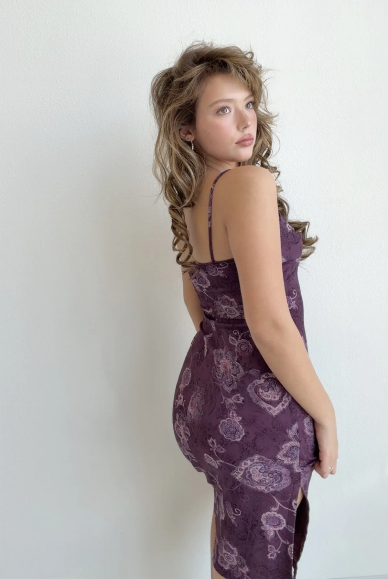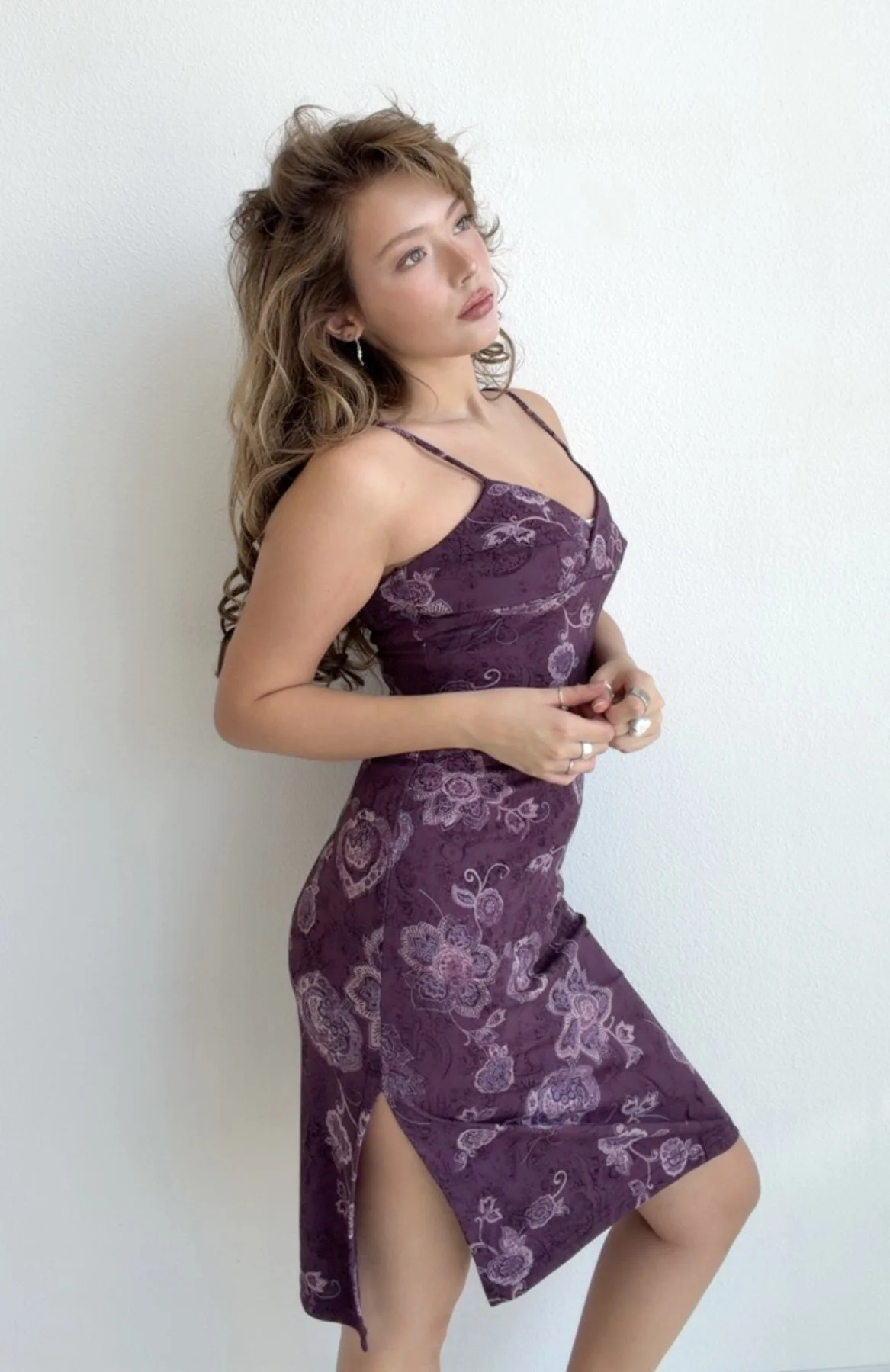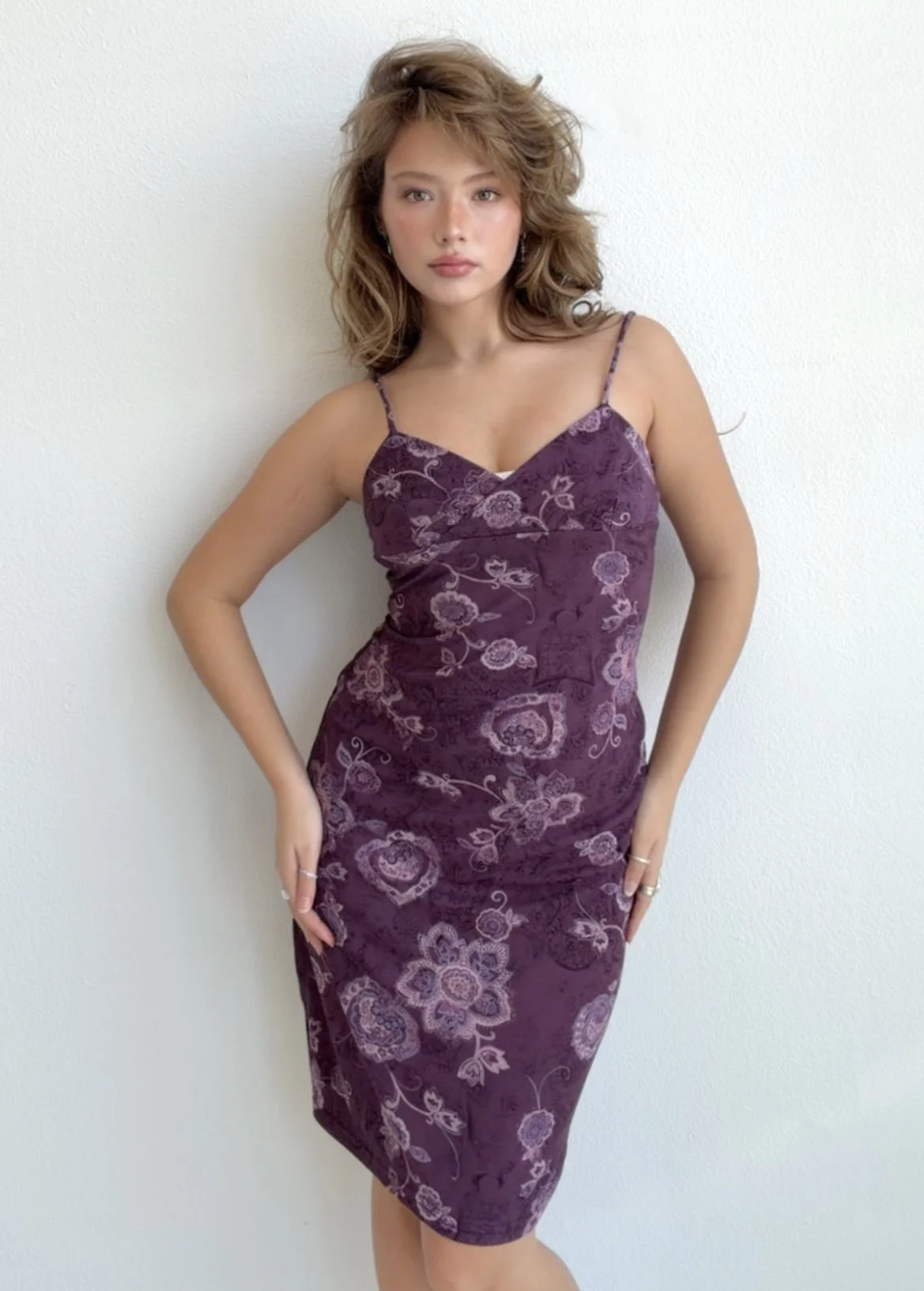 A sultry yet soft 1990’s vintage dress in the dreamiest plum shade. Covered in a delicate floral pattern with a flattering fitted shape that hugs just right. An easy throw-on dress that still feels elevated and timeless.