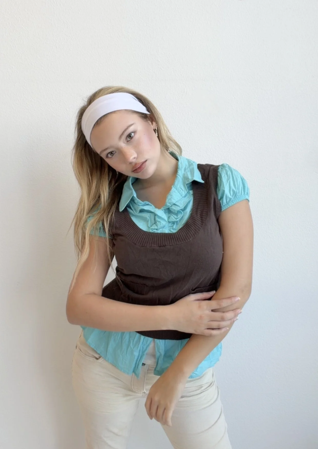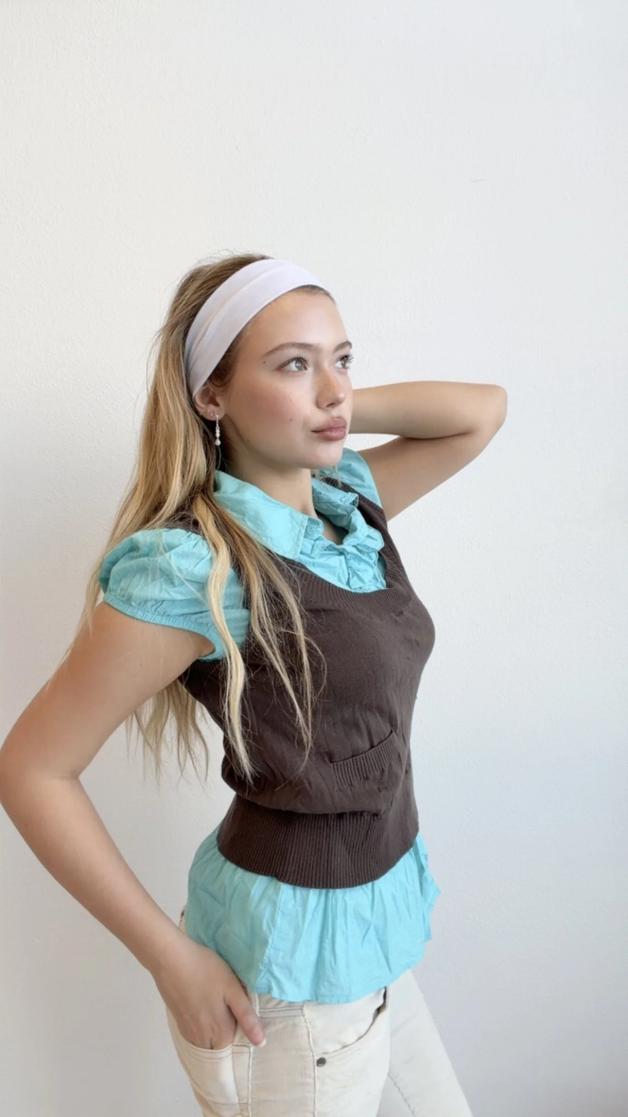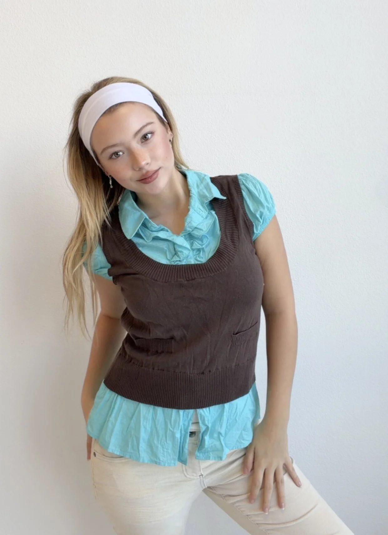 A perfectly layered vintage look in one piece. This brown knit sweater vest is styled over a turquoise ruffled blouse for a cozy-meets-feminine feel. Easy to dress up or wear casually with vintage denim for a chic, early-2000s-inspired outfit.