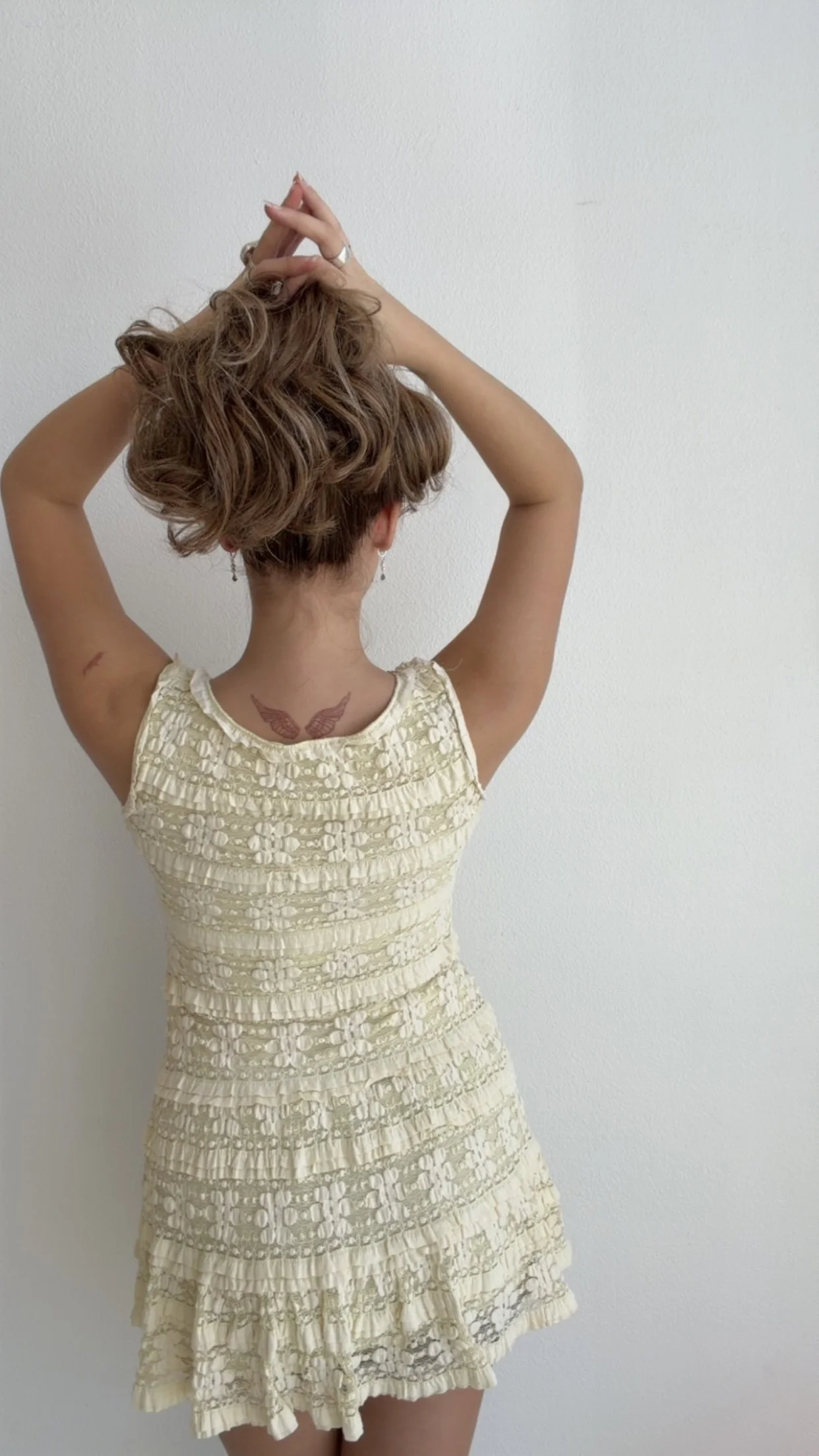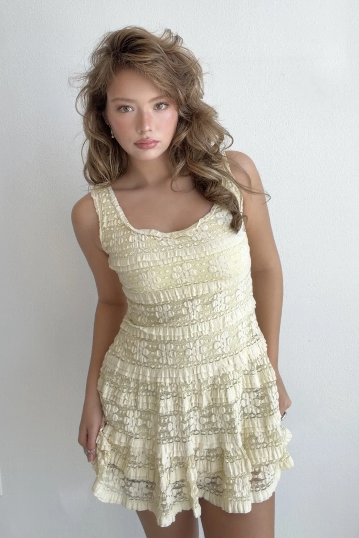 The prettiest yellow cream lace mini dress with soft tiered detailing and a romantic vintage silhouette. Features a fitted bodice with a flattering scoop neckline and a flowy skirt that moves beautifully with every step. Sweet, feminine, and effortlessly timeless — this one feels like a little vintage dream.