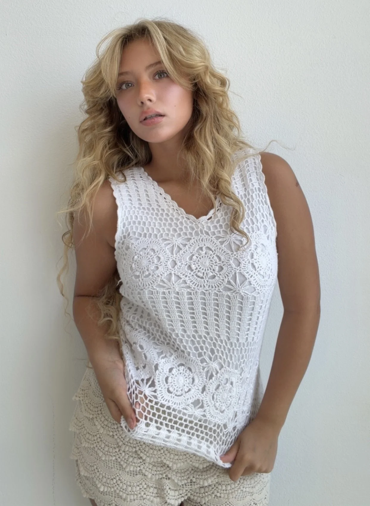 Beautiful white sleeveless crochet top featuring intricate floral lacework and open-knit detailing. Perfect for layering over a bralette or swimsuit.