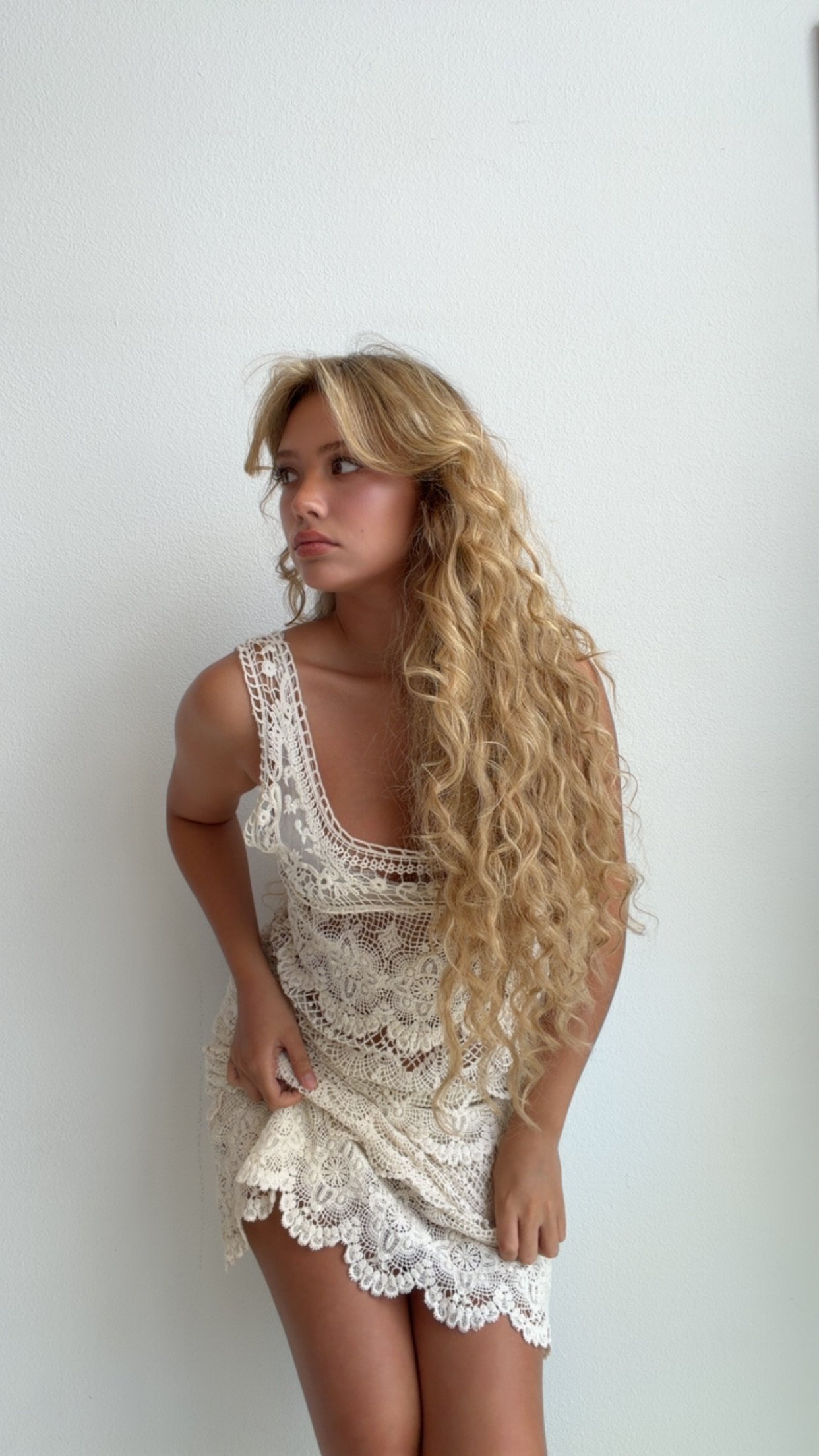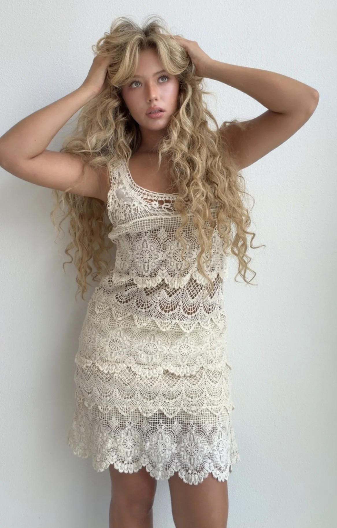 Dreamy ivory crochet lace two piece set featuring a sleeveless square neckline top and matching mini skirt. The crochet has the prettiest floral lace detailing throughout with scalloped edges that give it such a romantic, beachy fairy feel. Perfect styled together as a set or worn separately with basics.