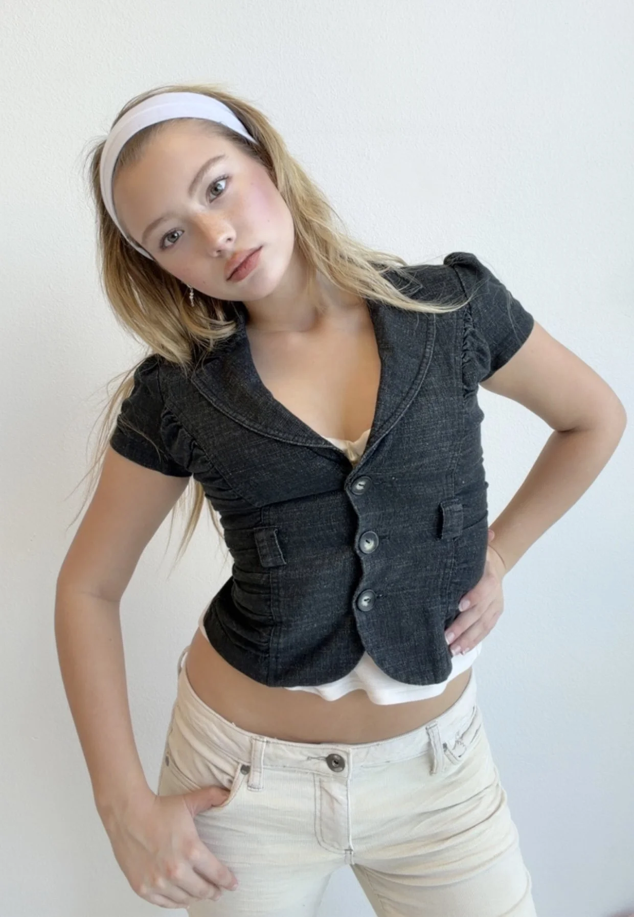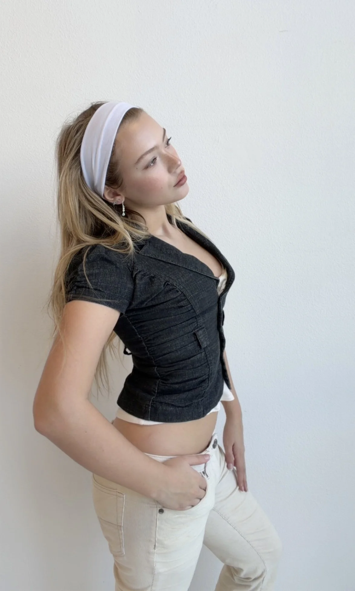 Sleek, structured, and effortlessly cool. This vintage cropped blazer-style top features a fitted silhouette with a deep v-neckline, button front closure, and subtle ruching at the sides for a flattering shape. The short sleeves and tailored feel give it that iconic early-2000s “going out top” energy.
