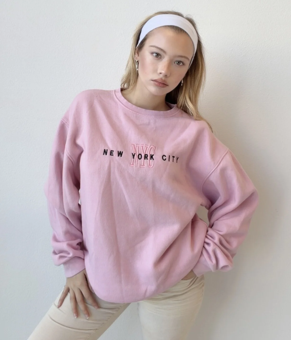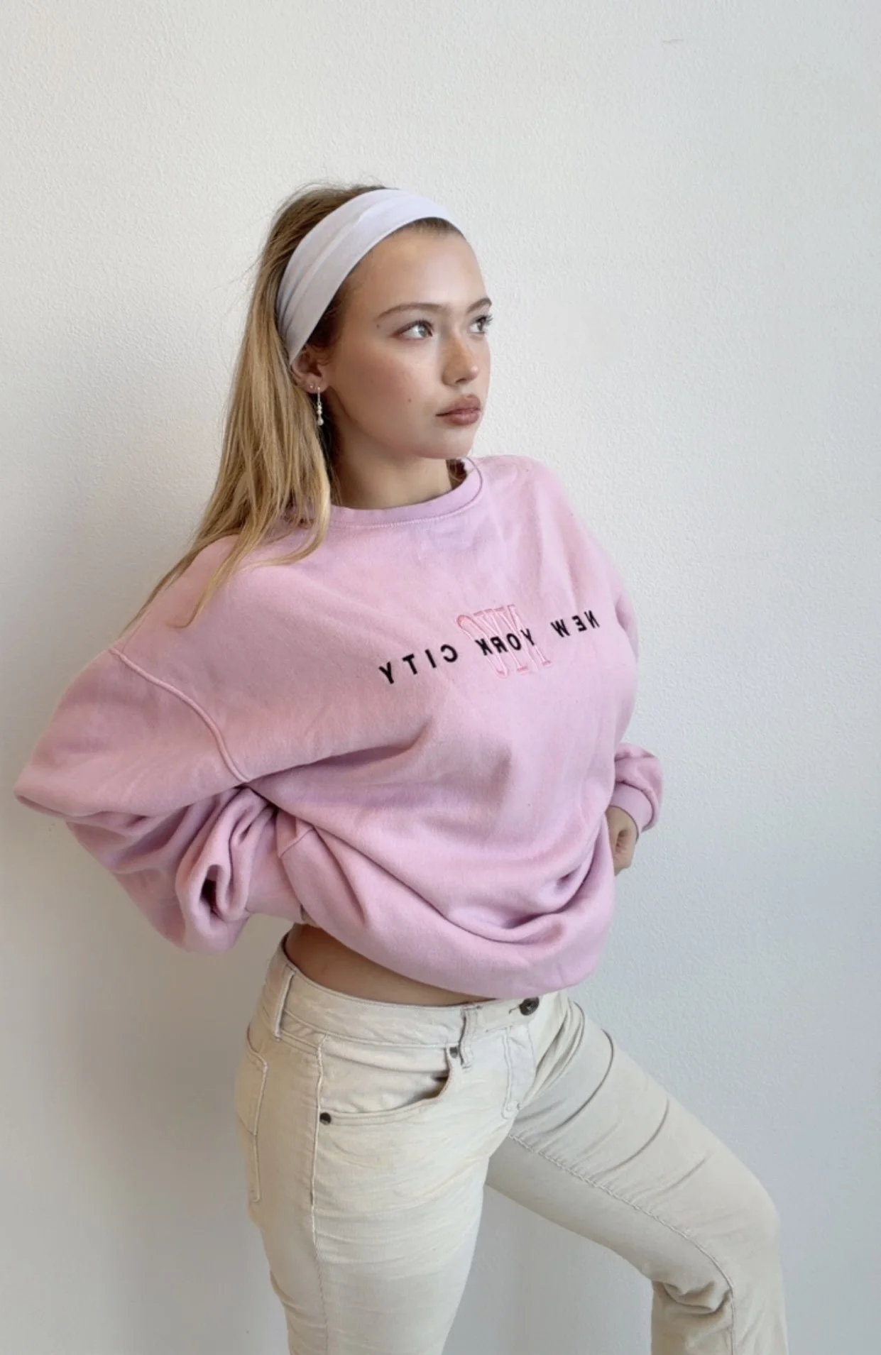 The perfect everyday cozy layer. Soft blush pink with an embroidered New York City detail, relaxed fit, and effortless off-duty vibes. Easy to style with vintage denim or lounge pants for a casual, feminine look.