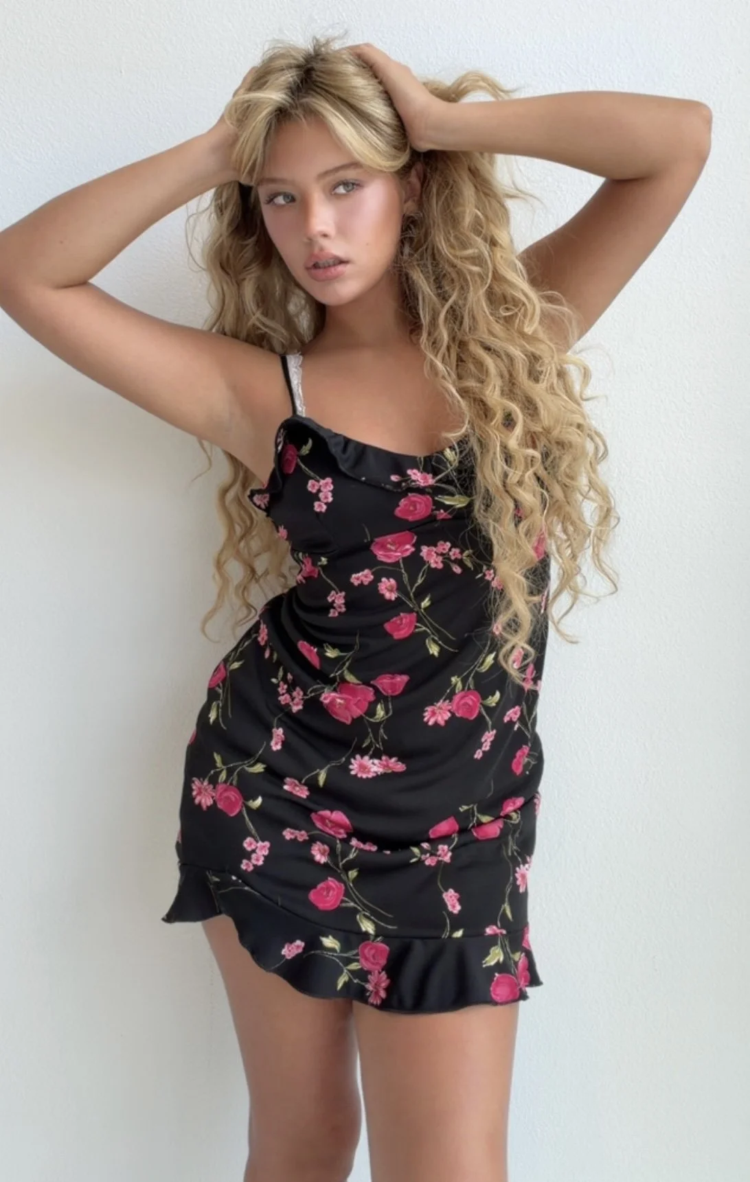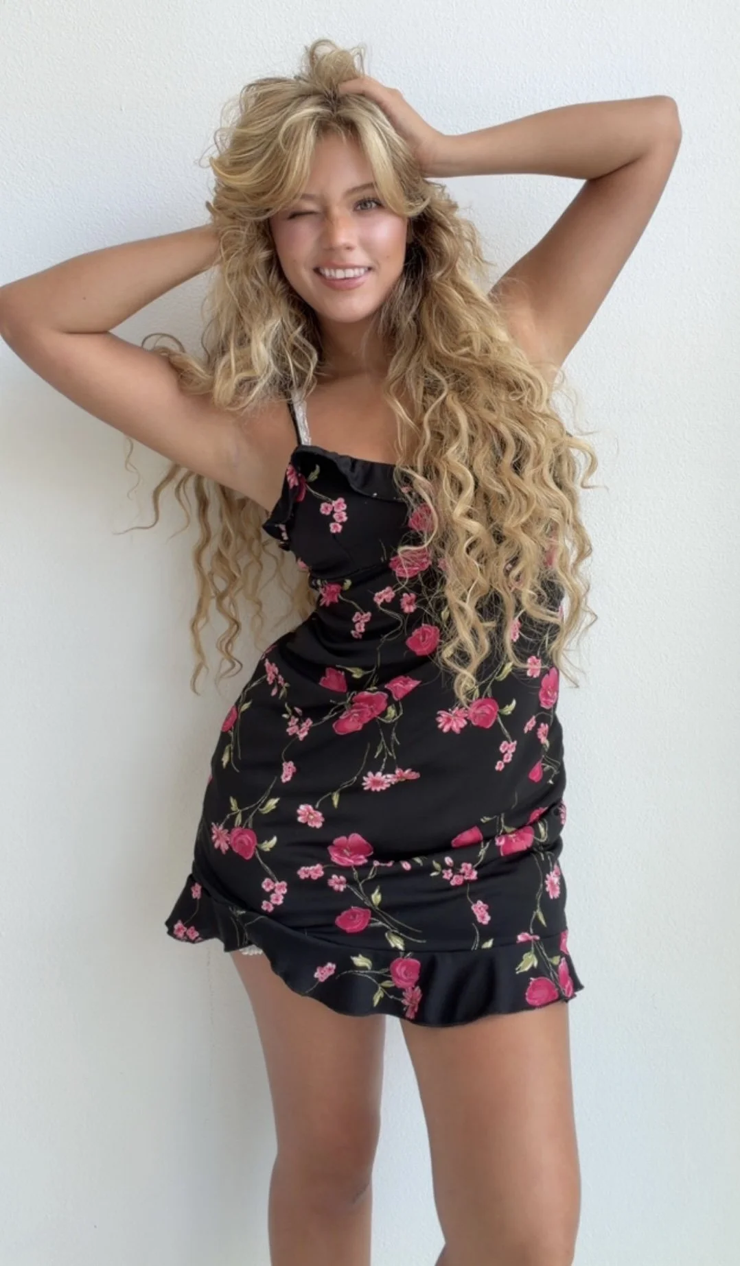 Sultry black mini dress featuring pink rose print, cowl neckline, and ruffle hemline. Flirty and feminine for date nights or going out.