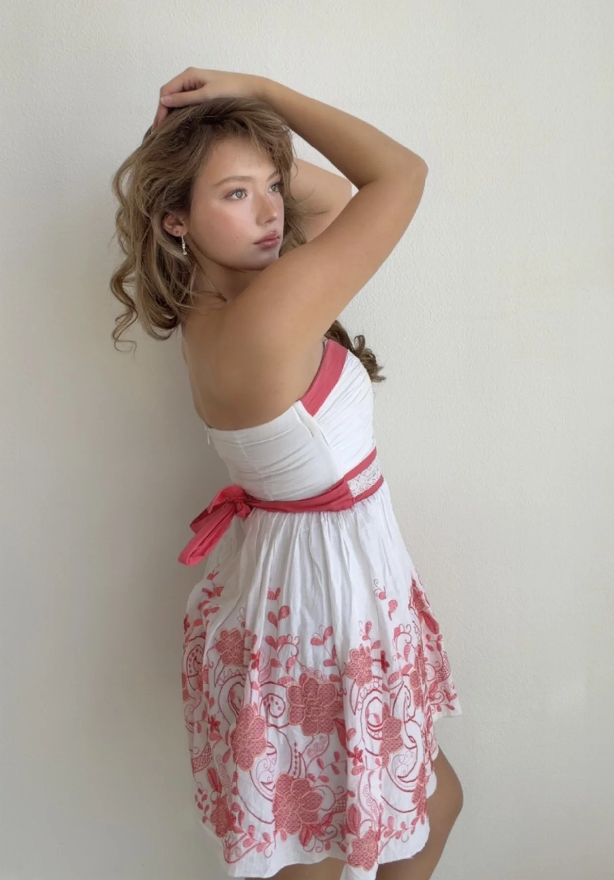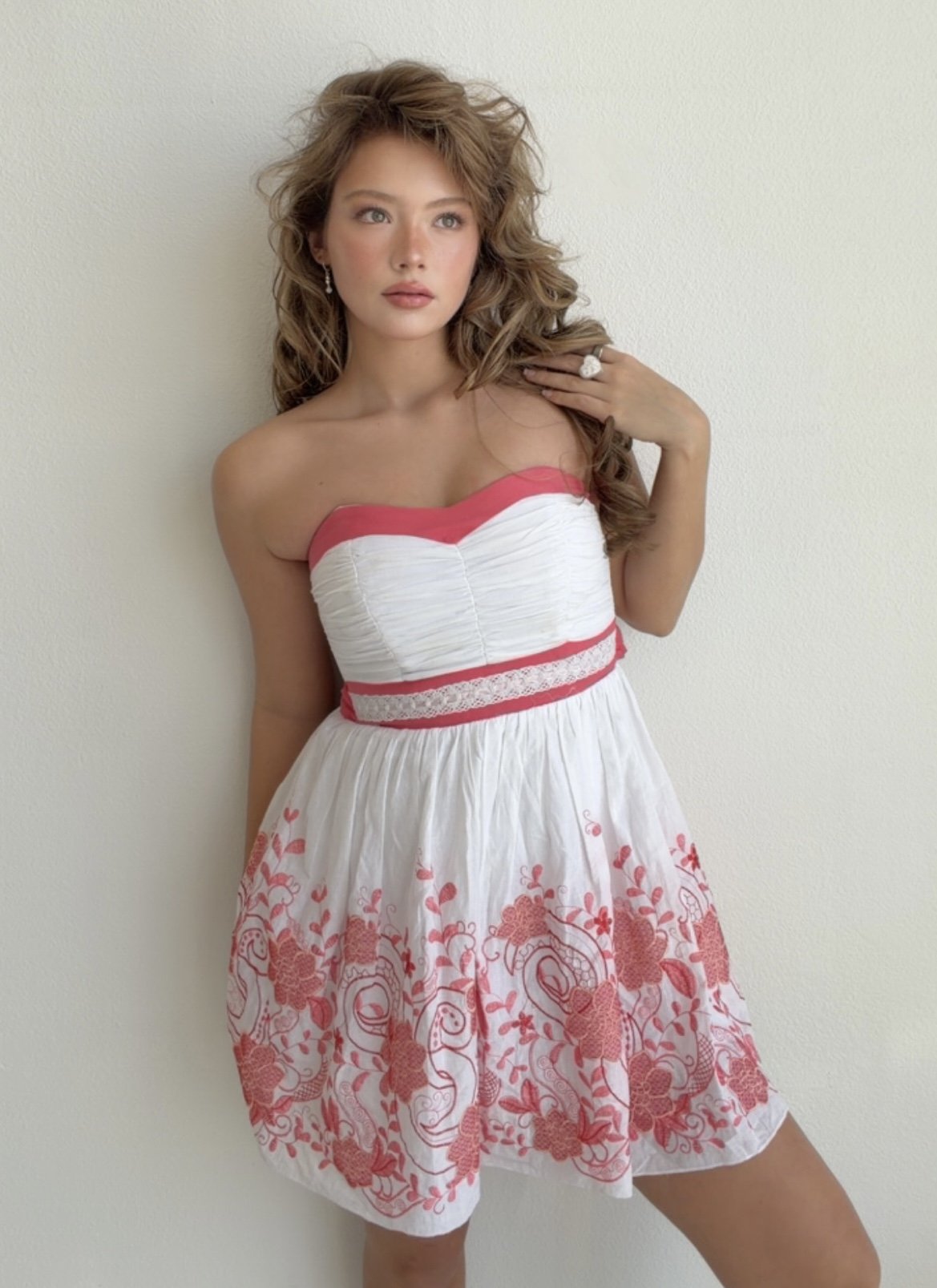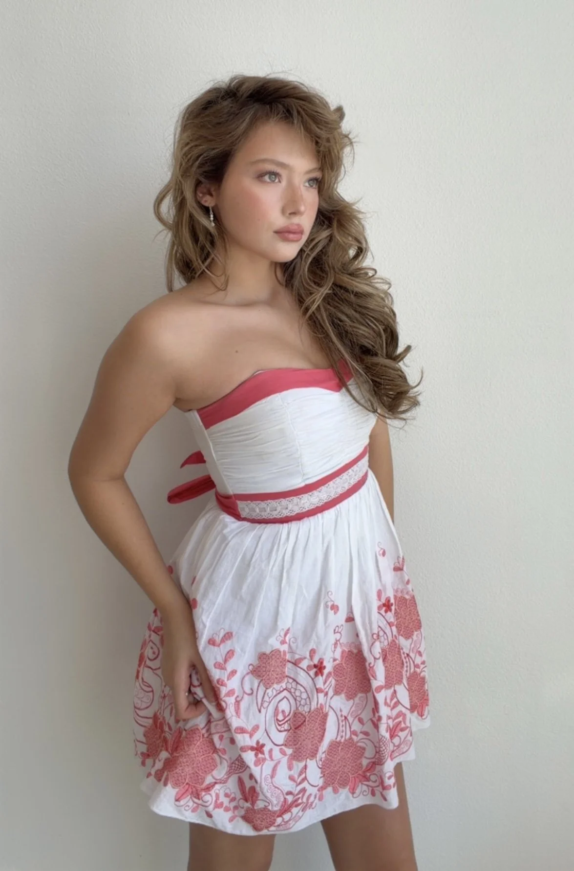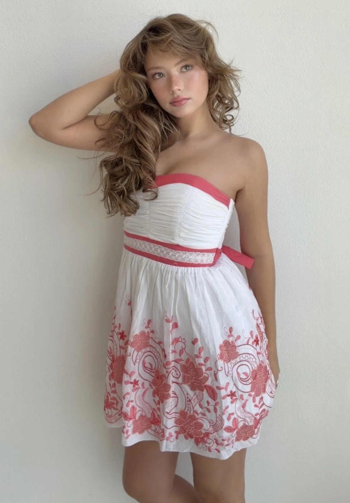 The sweetest strapless dress with pink accents and delicate floral embroidery for a true vintage summer moment. Stretchy material.