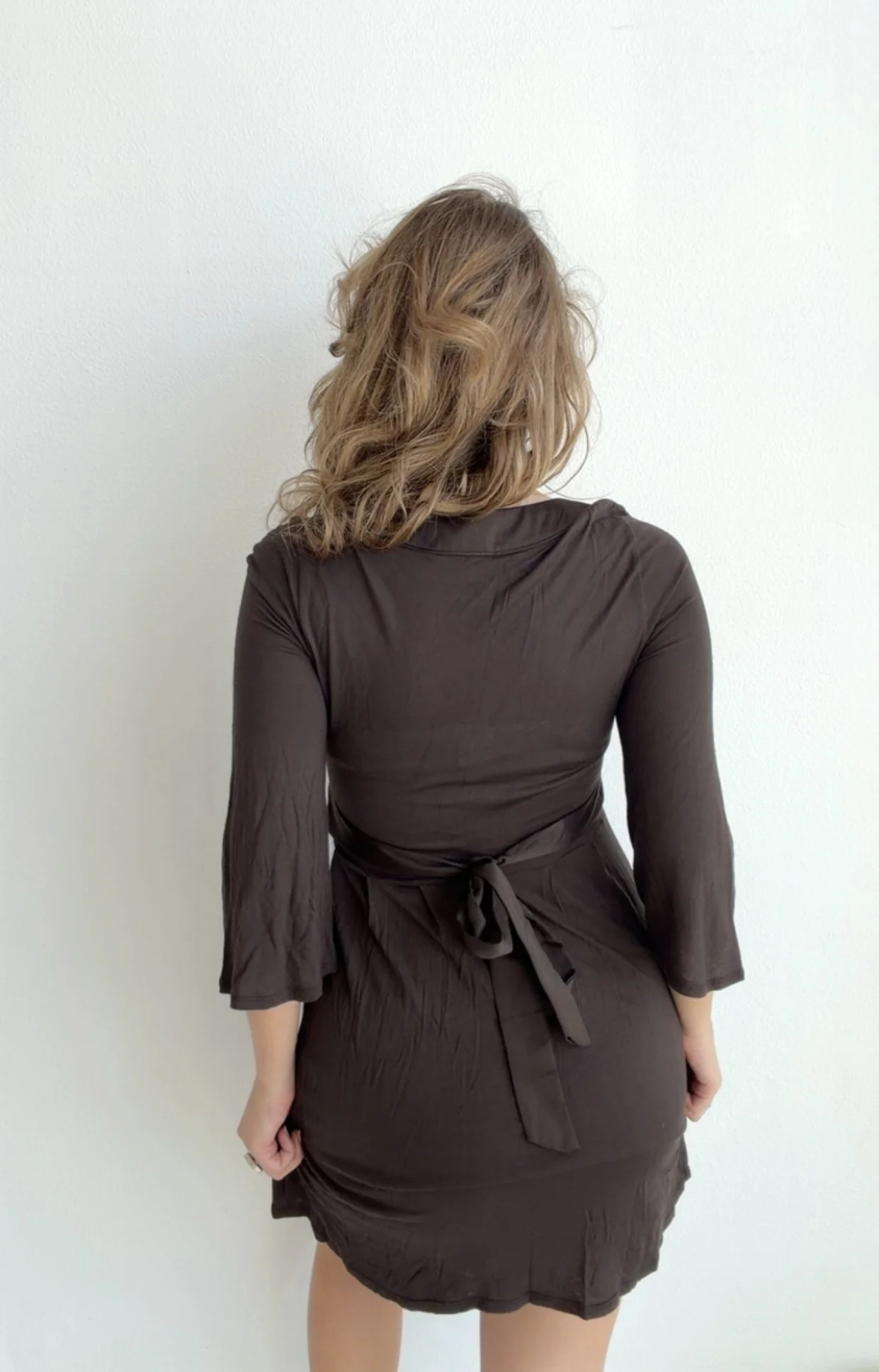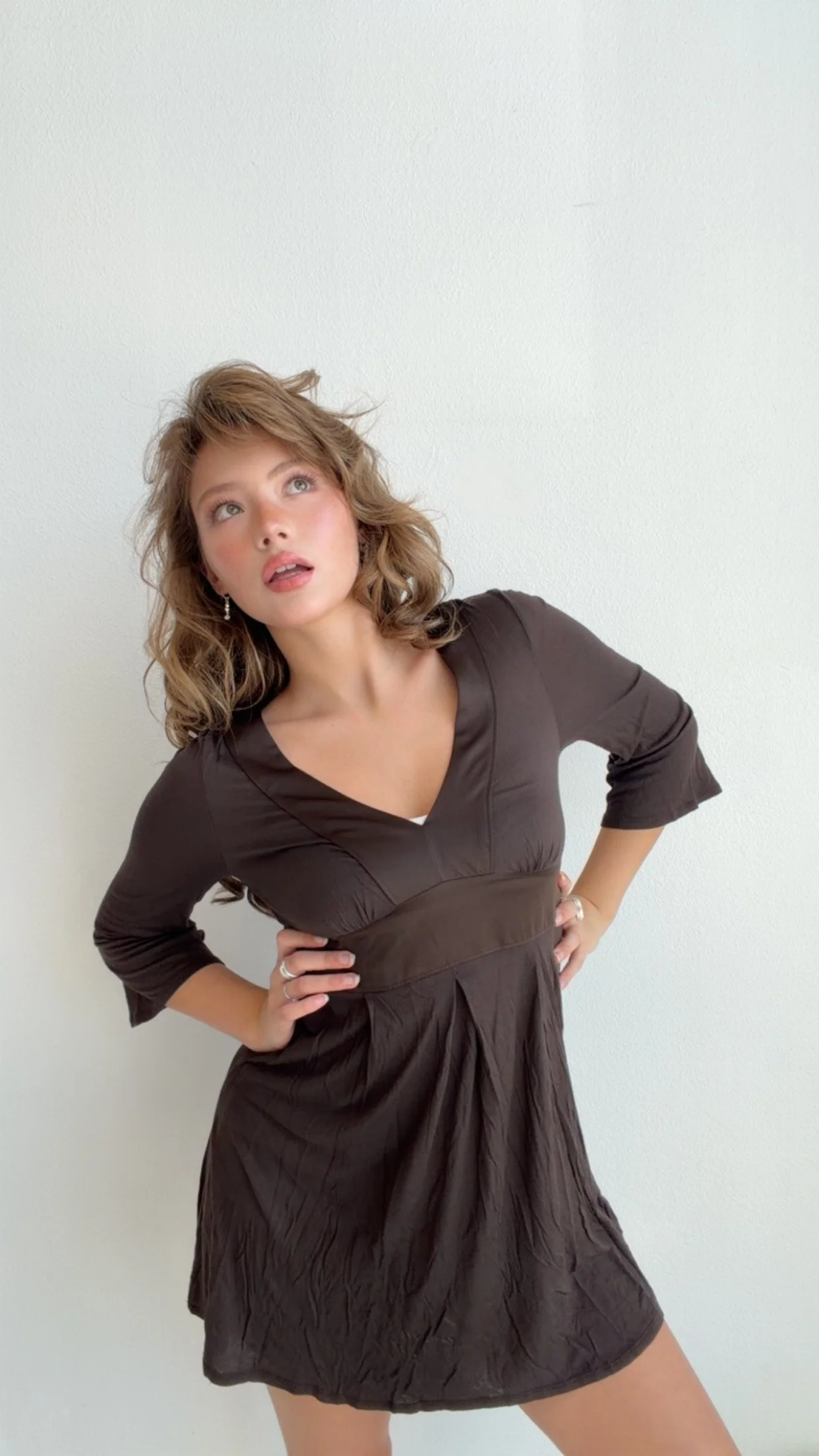 A classic chocolate brown mini dress with a deep V neckline and an empire waist that flatters so effortlessly. Features lightweight, flowy fabric and three-quarter sleeves for an easy, chic look. Simple, timeless, and one of those pieces you’ll reach for again and again.