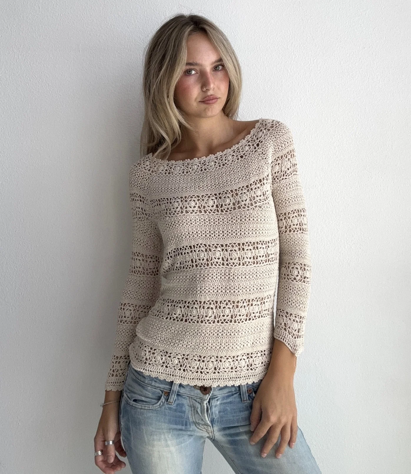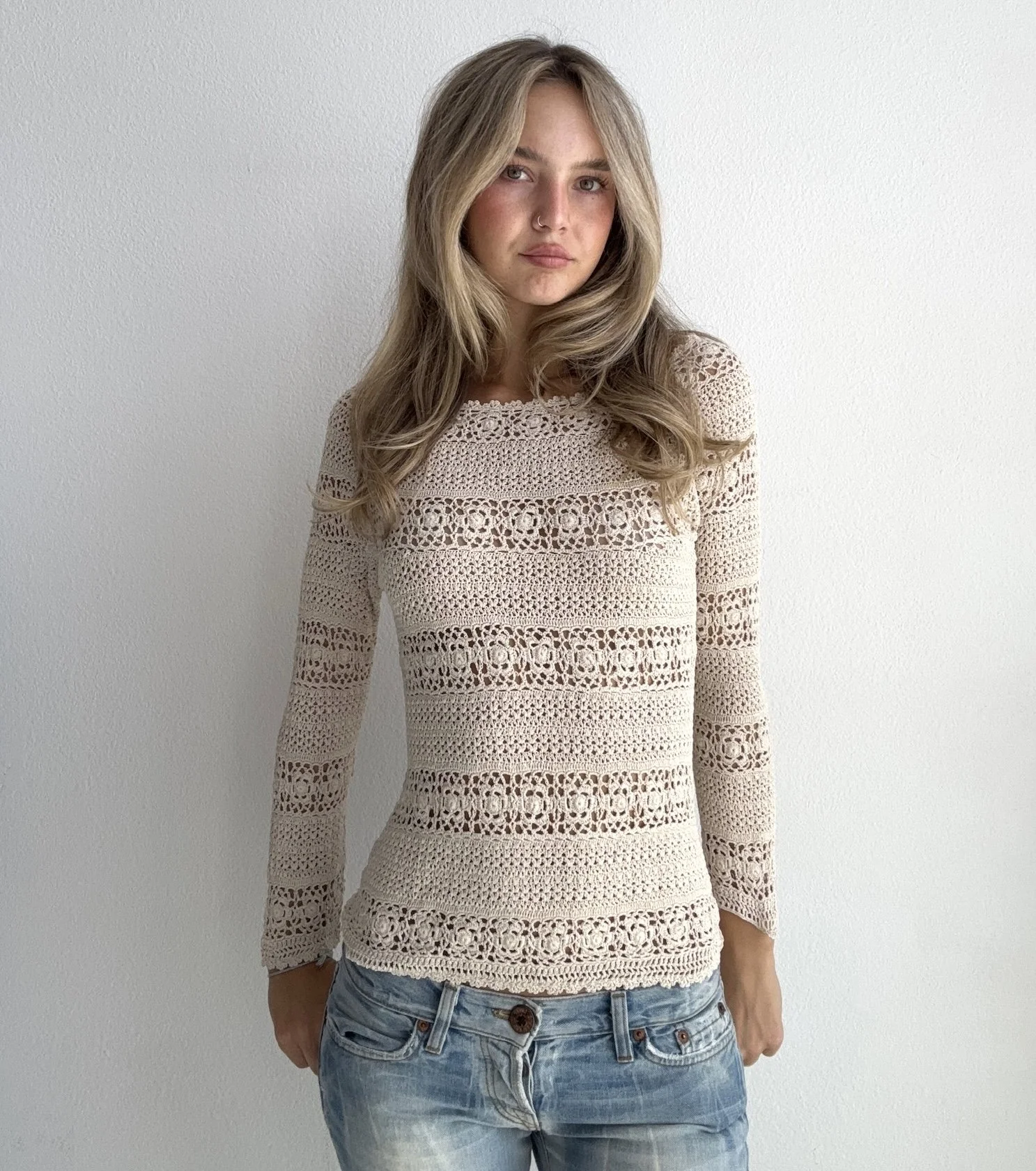 Beautiful cream long sleeve crochet top featuring intricate open-knit lacework throughout. Feminine fitted silhouette with timeless boho charm.
