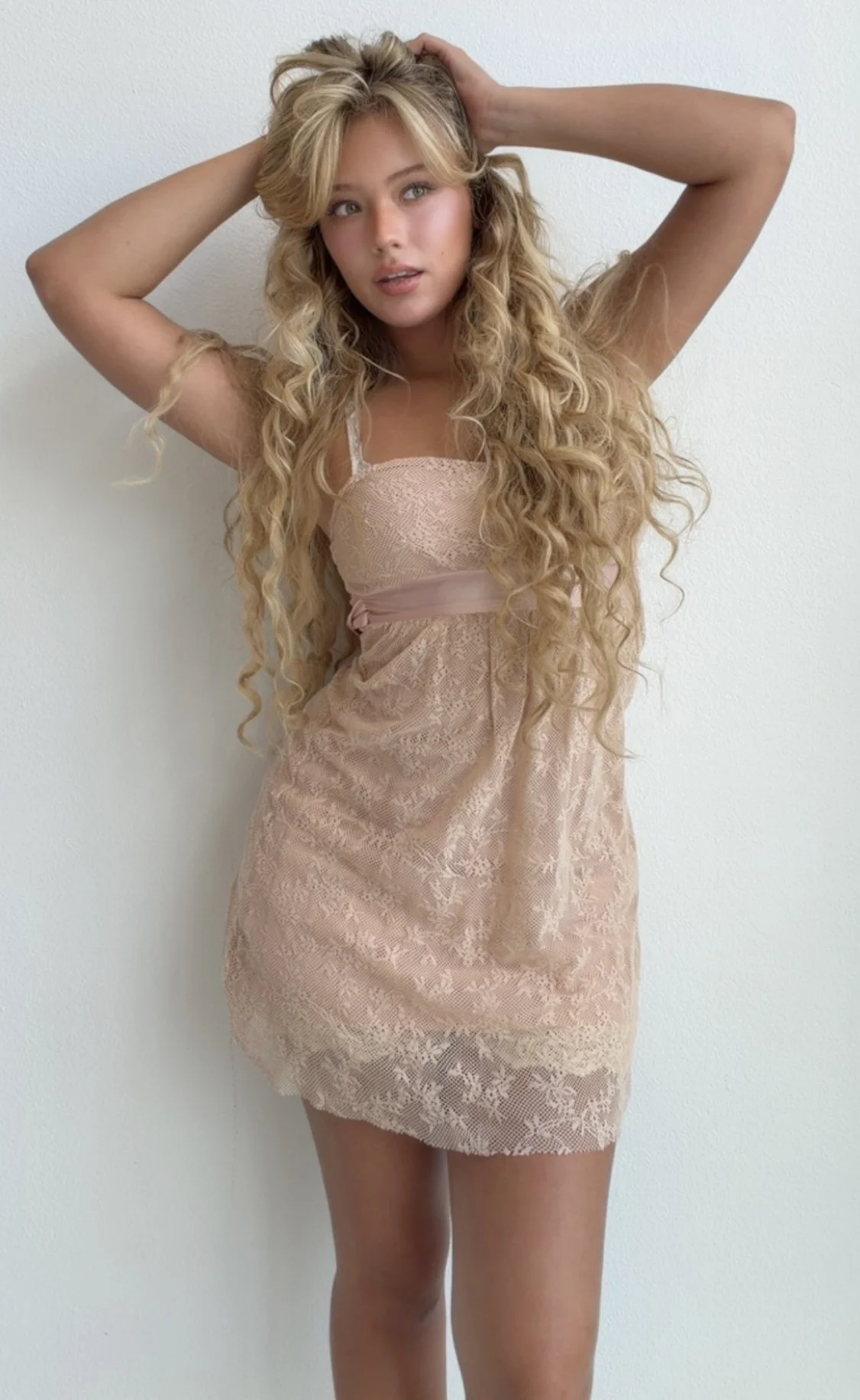 Romantic blush pink lace mini dress with a soft feminine fit and delicate sheer lace overlay. Features dainty straps, a satin waist ribbon, and a dreamy layered lace look. Perfect for a coquette, bridal, or fairy-inspired outfit.