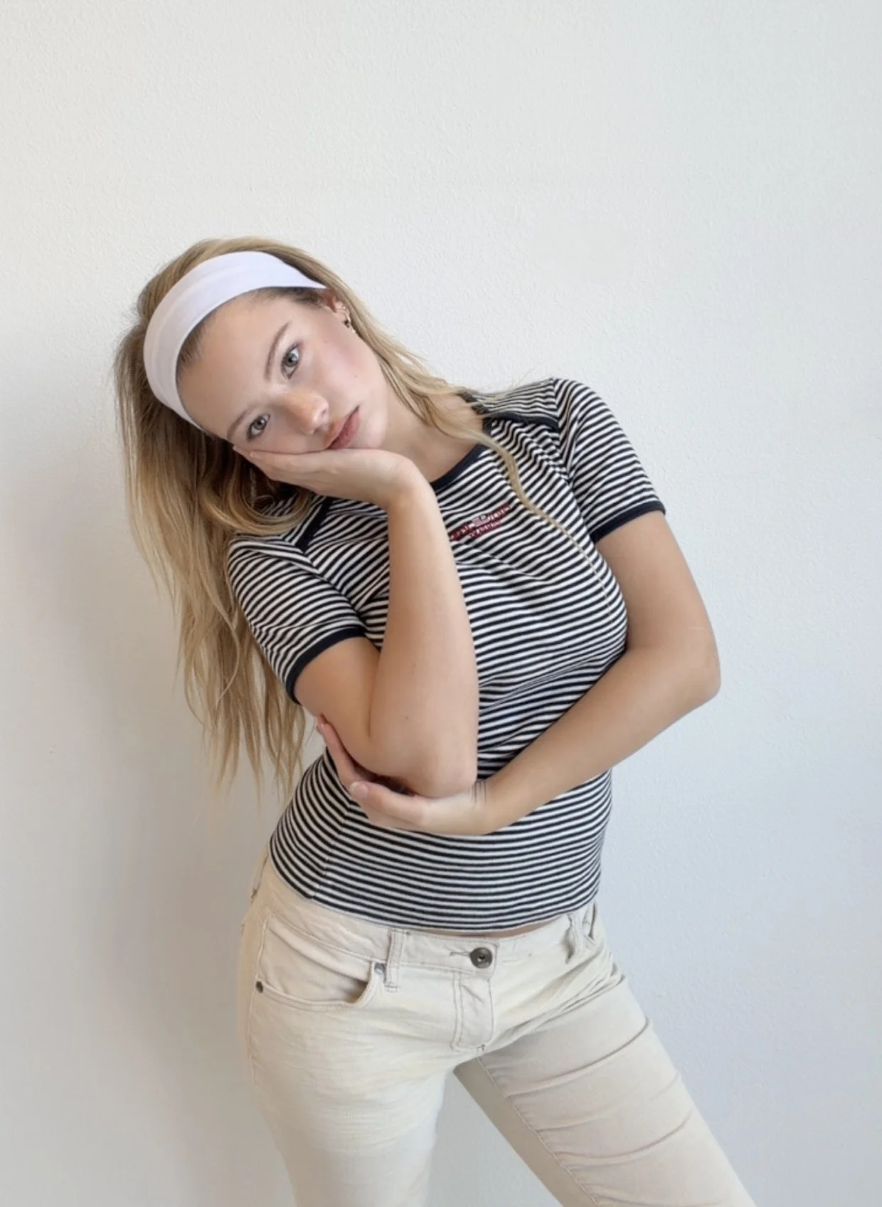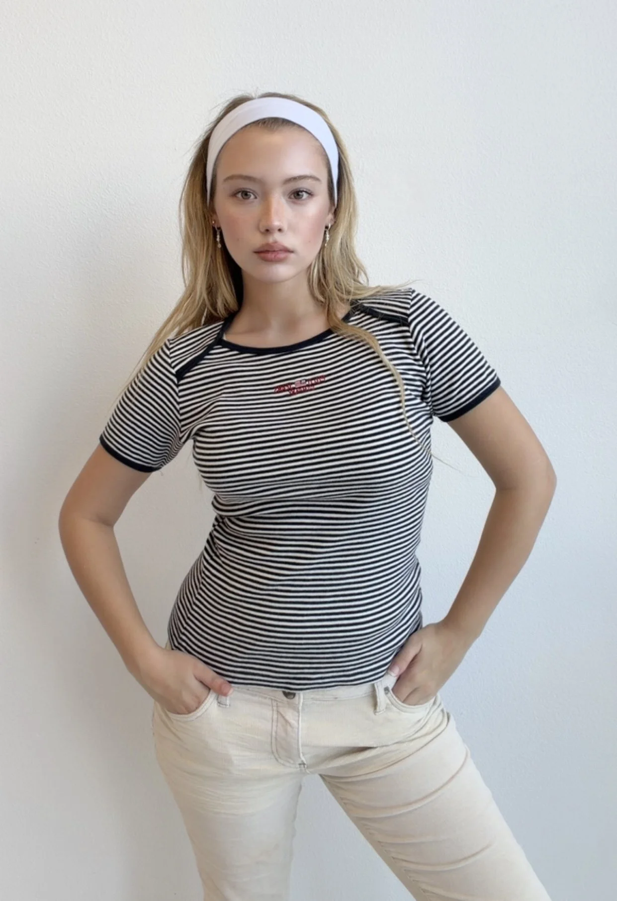A classic Ralph Lauren fitted staple with subtle vintage vibes. This navy and white striped baby tee features contrast trim and a flattering, stretchy fit — perfect for everyday wear with vintage denim or layered under jackets.