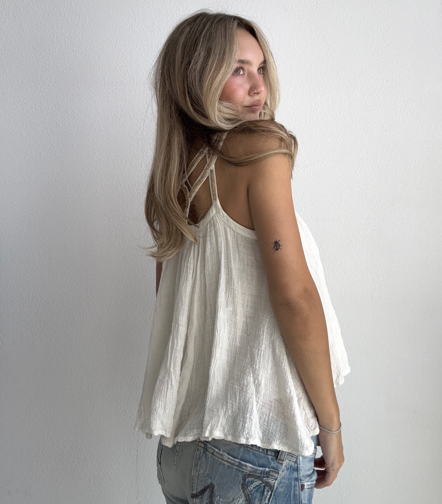 Dreamy ivory gauze top featuring a flowy silhouette with unique loop halter neckline detailing. Lightweight and airy for an effortless bohemian look.