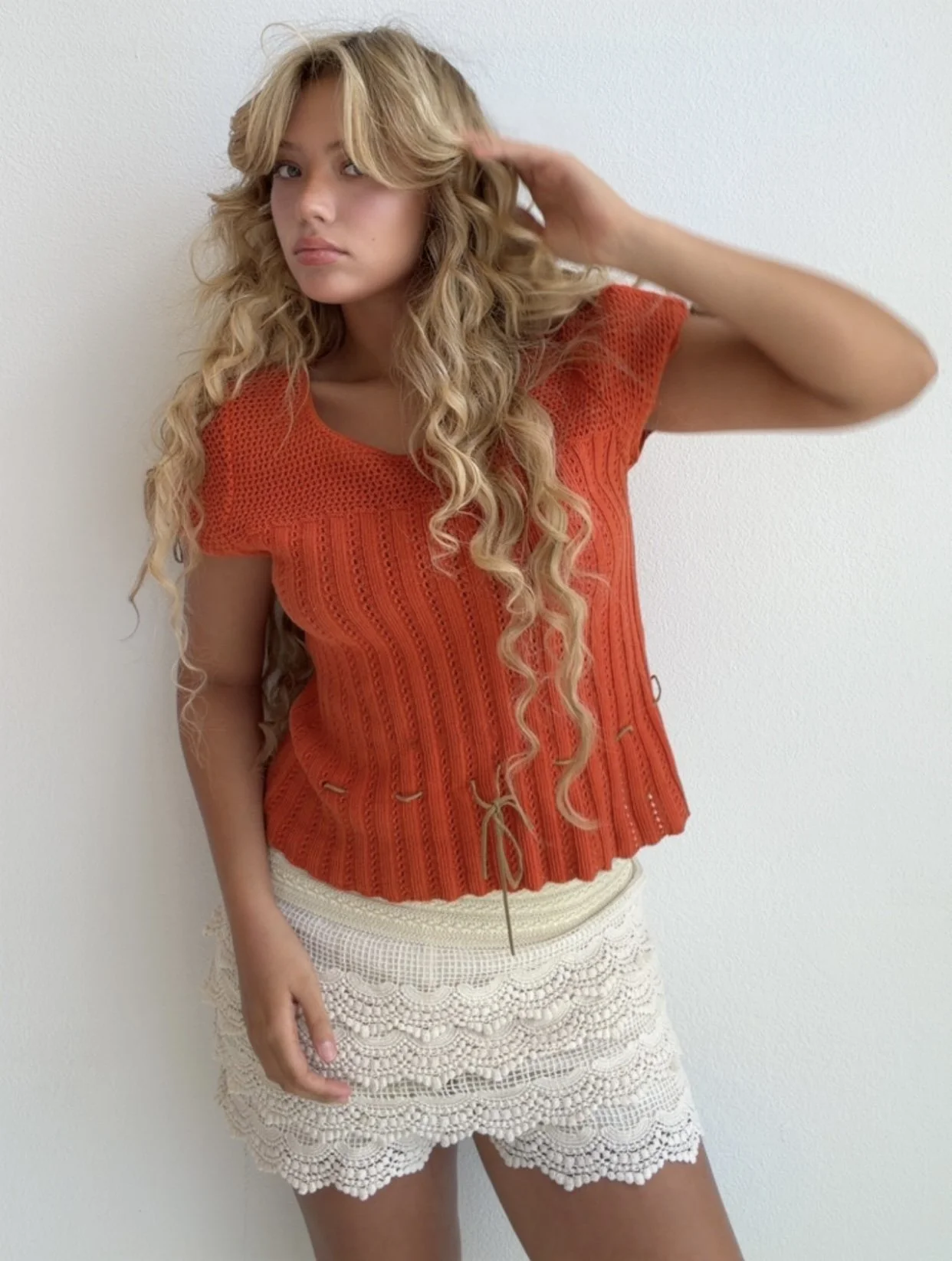 Rich burnt orange knit top featuring ribbed detailing, cap sleeves, and adjustable lace-up waist accents. Soft stretchy knit with a flattering fitted shape. Such a cute transitional piece for fall or year-round styling.