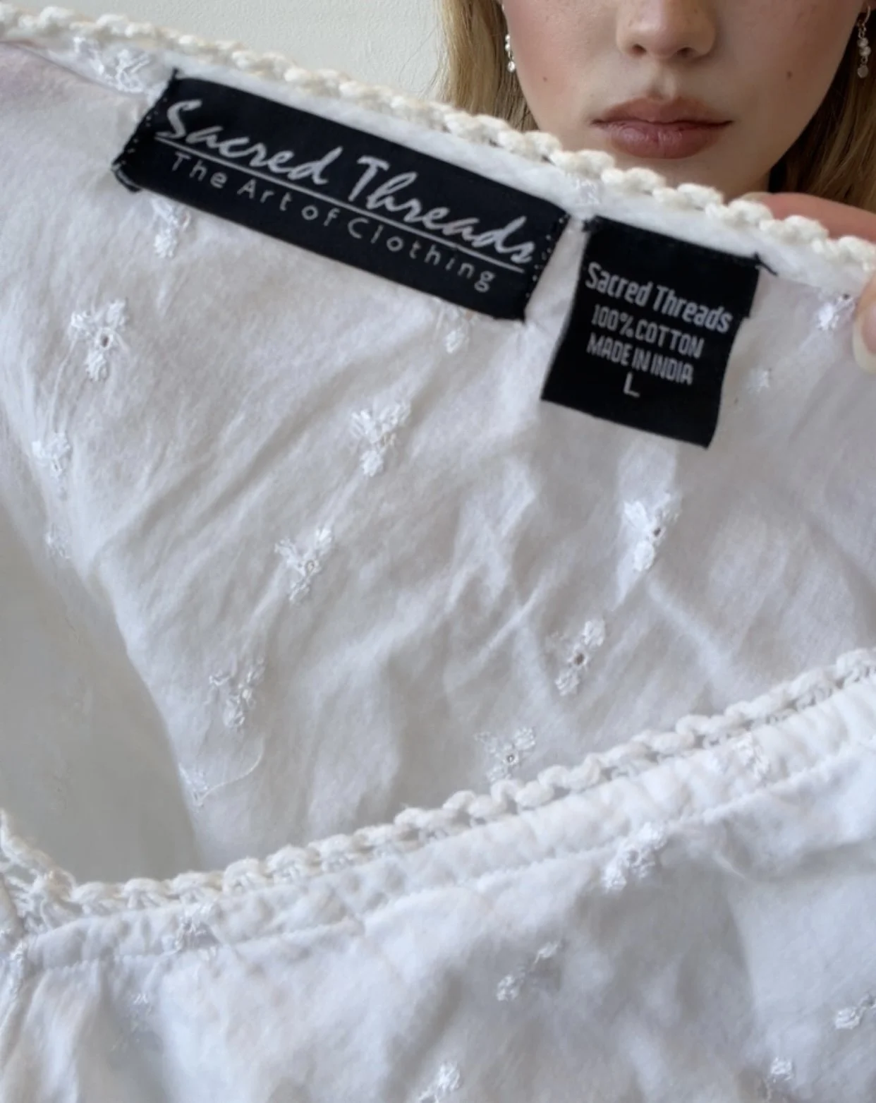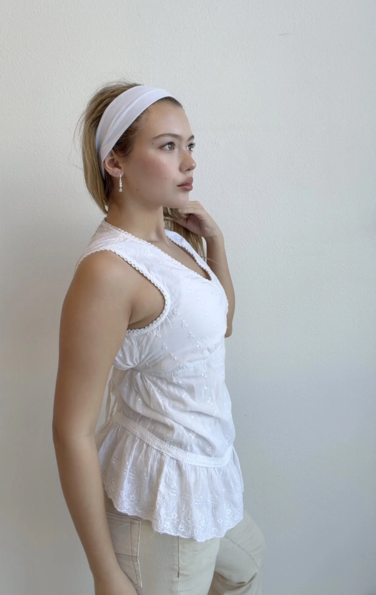 Soft, airy, and effortlessly romantic. This vintage white babydoll tank features delicate eyelet embroidery throughout with a flattering v-neckline and flowy peplum hem. Lightweight and breathable with the prettiest feminine details, making it perfect for warm days or easy layering.