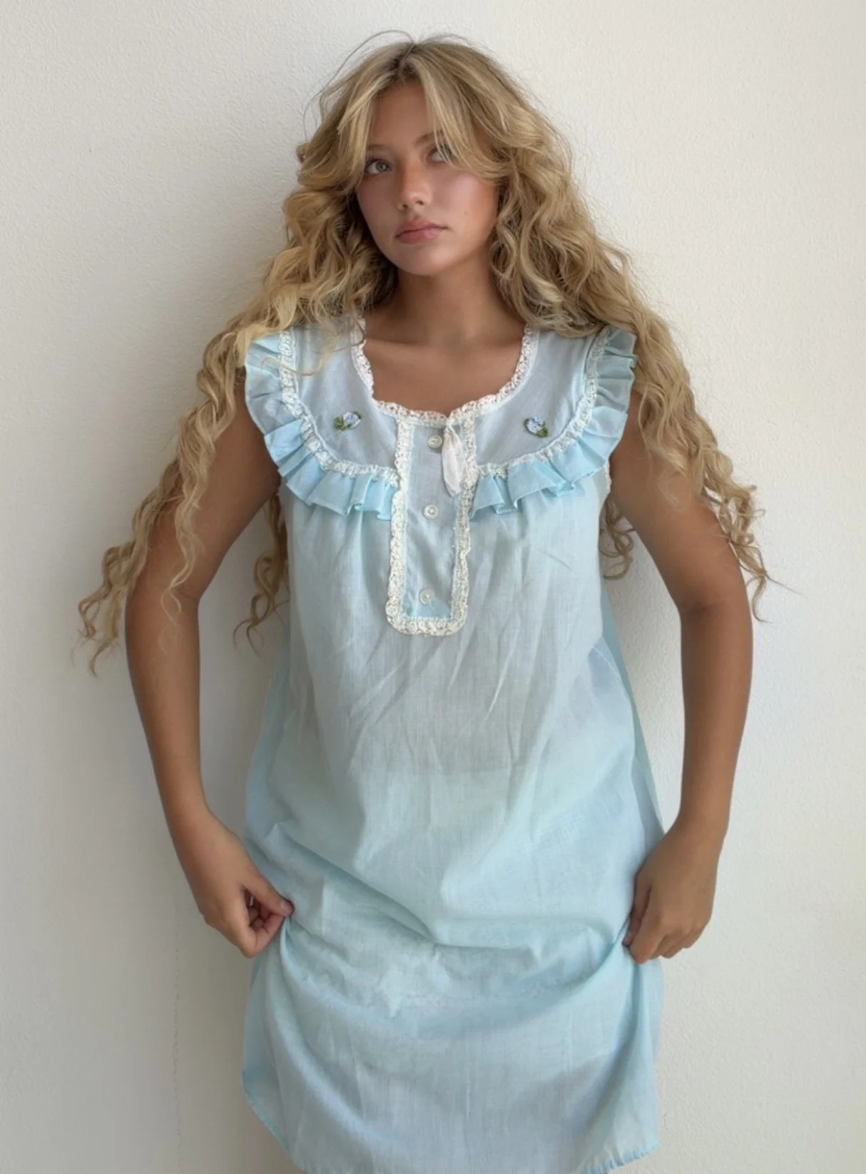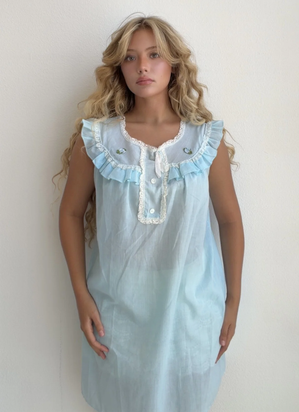 Adorable vintage-inspired light blue nightgown dress with delicate ruffle trim, lace accents, and button-front detailing. Features a loose airy silhouette with soft feminine charm and nostalgic cottage vibes. Wear it as a dress, loungewear piece, or styled with boots and accessories for a unique vintage look.