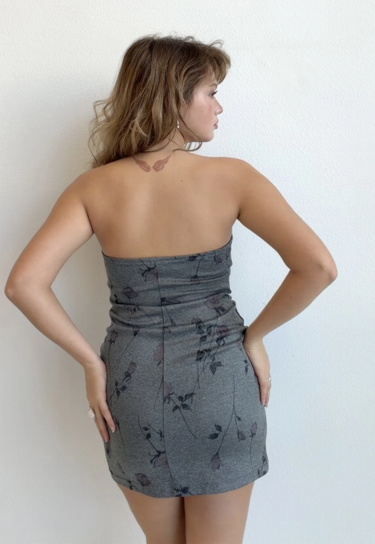 A fitted strapless mini with a delicate floral print and soft gray base. Flirty, feminine, and perfect for nights out or layering with a cardigan.