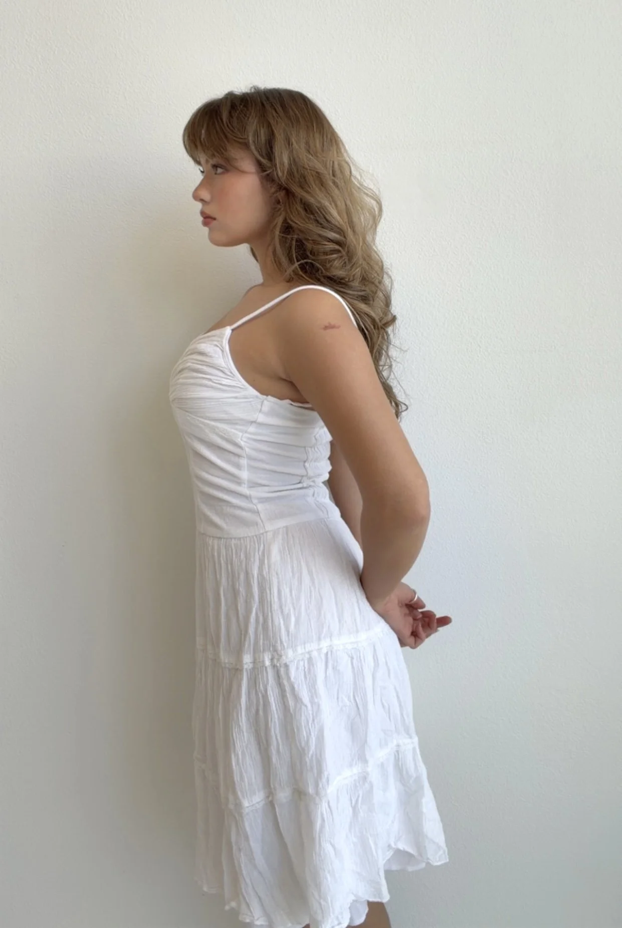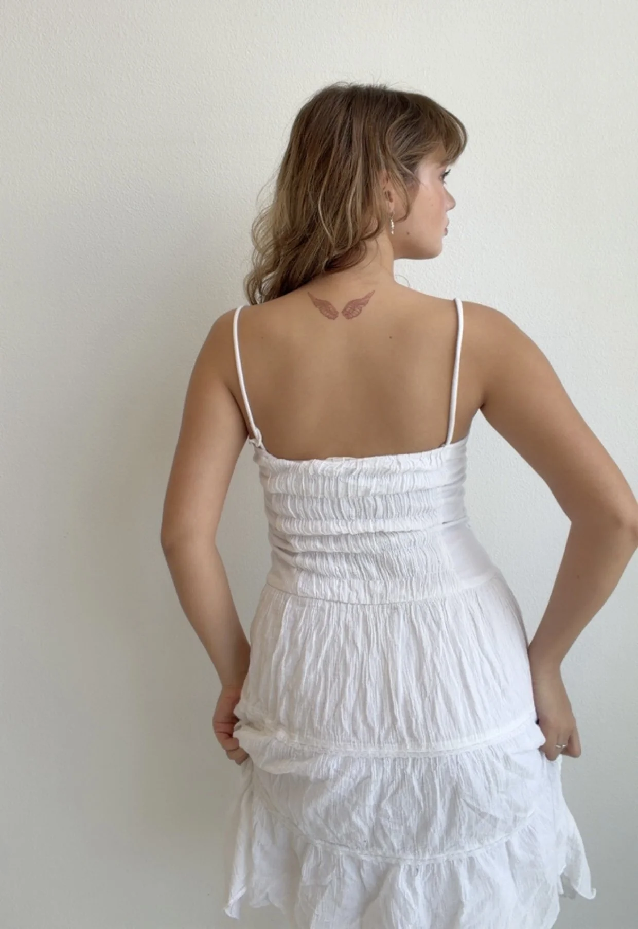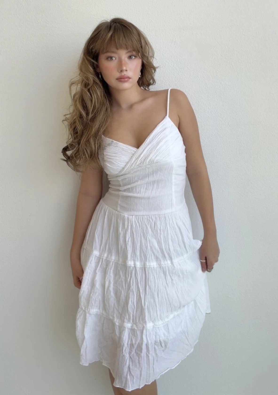 An effortlessly romantic white dress with delicate tiers and a dreamy flow. This one feels like a summer fairytale—perfect for picnics, bridal moments, or barefoot days in the sun.