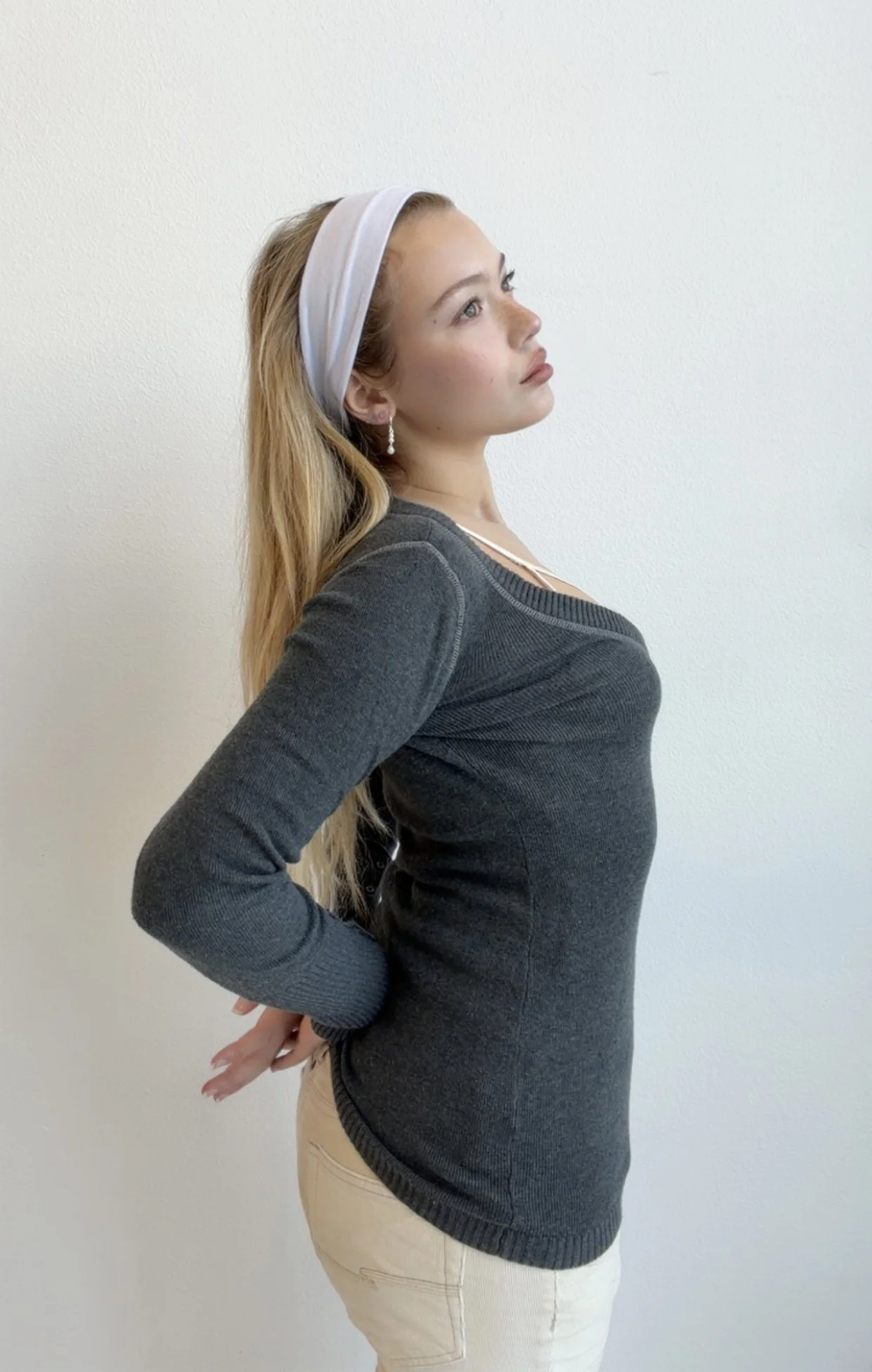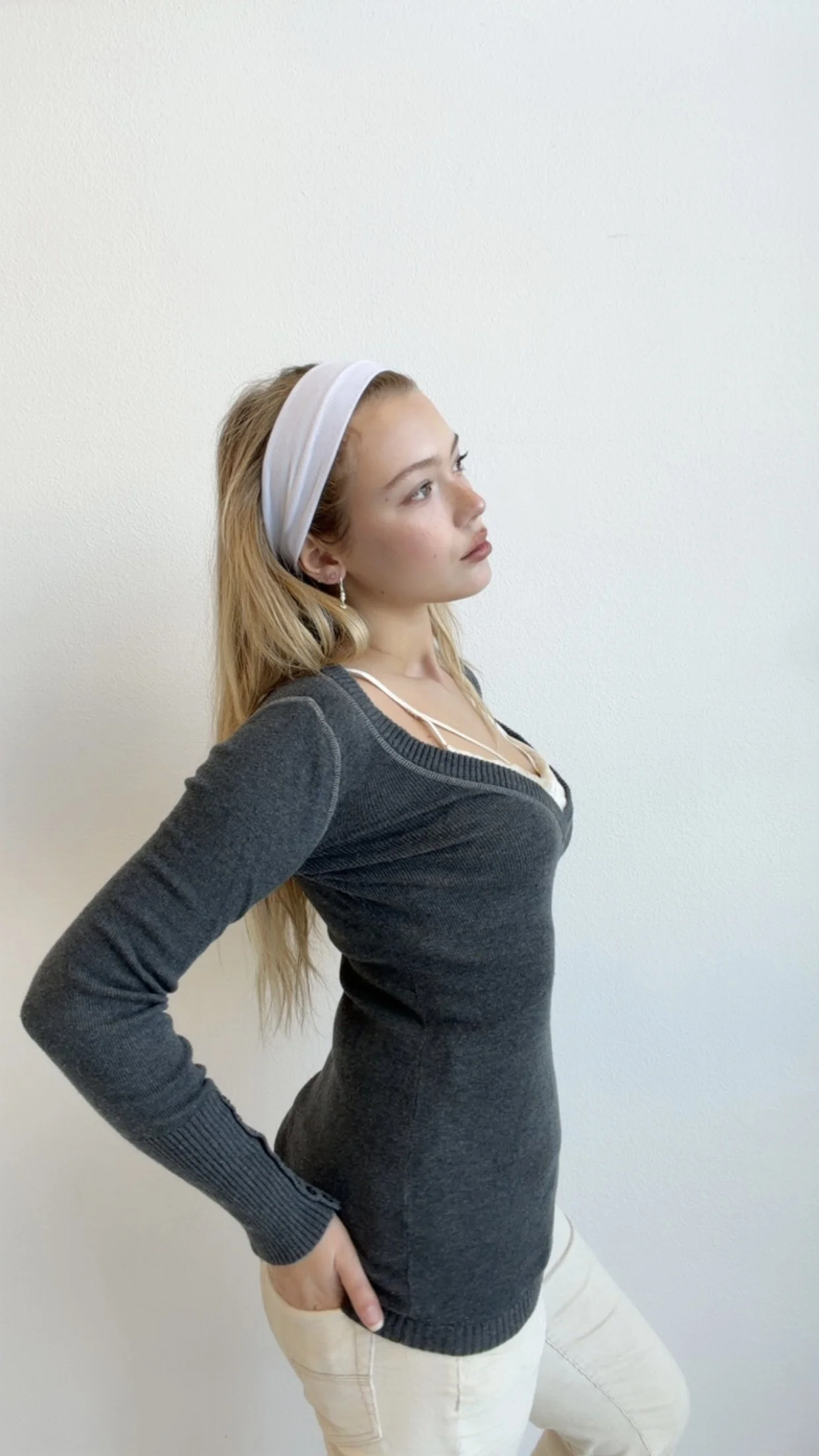 Soft, flattering, and effortlessly chic. This vintage charcoal knit top features a deep v-neckline with a built-in layered look and fitted silhouette that hugs just right. The ribbed cuffs with button details add a subtle feminine touch, giving it that early-2000s understated elegance.
