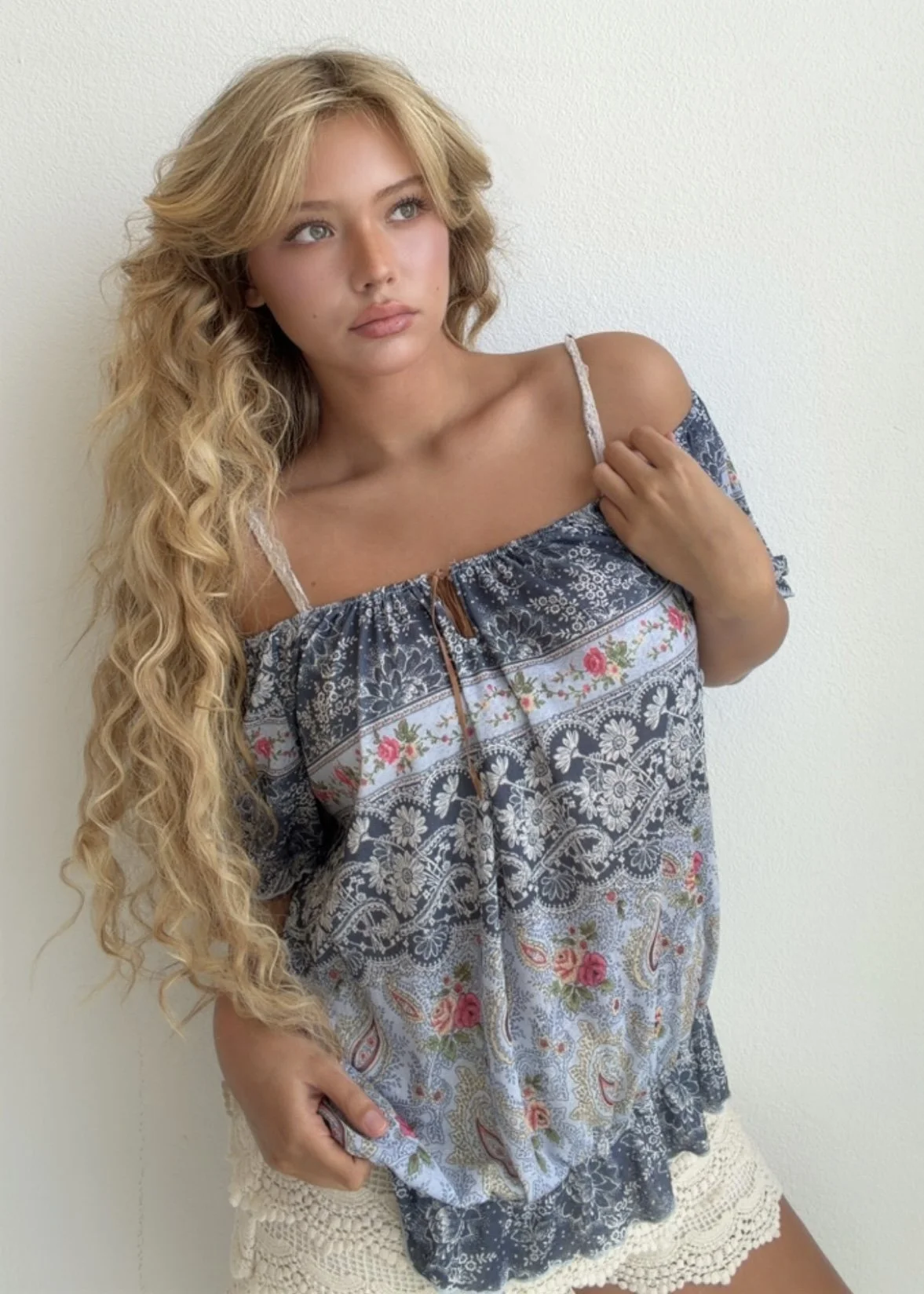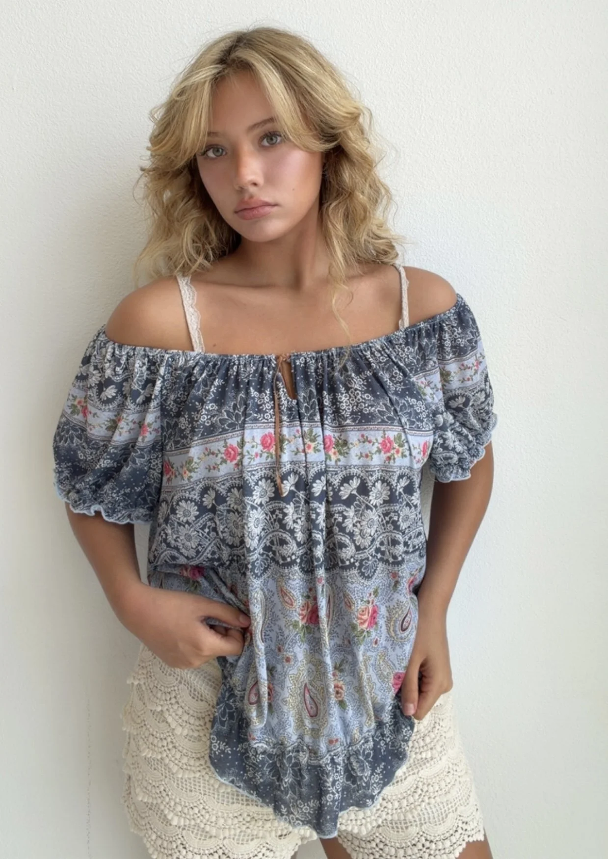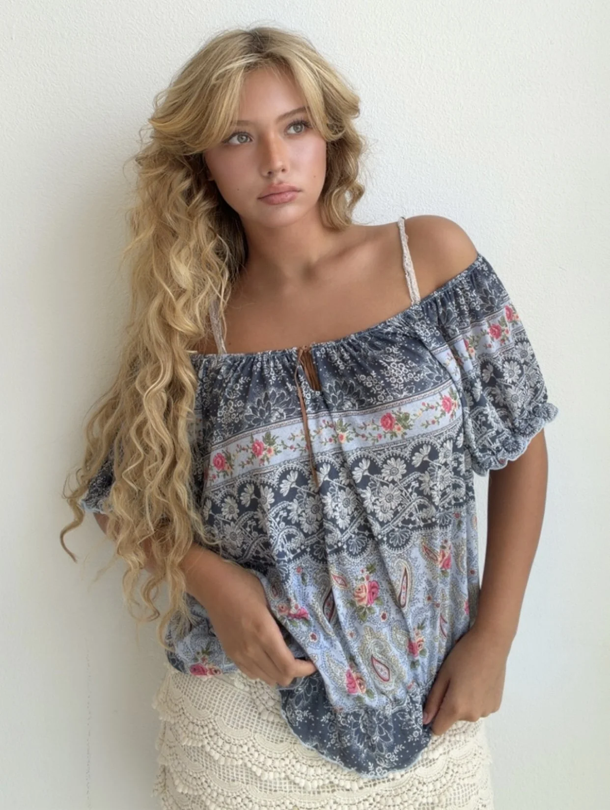 Flowy off-shoulder blouse with mixed paisley and floral patchwork print in soft denim blue tones. Lightweight and breezy with boho charm.