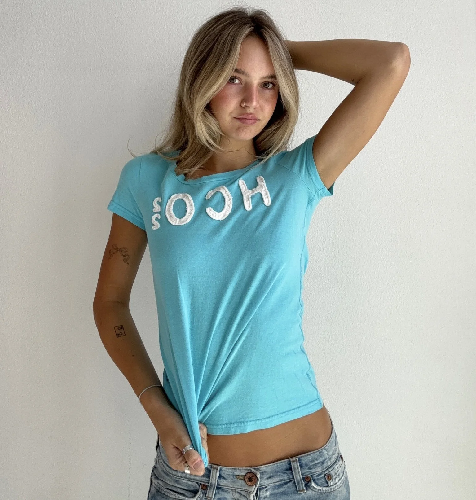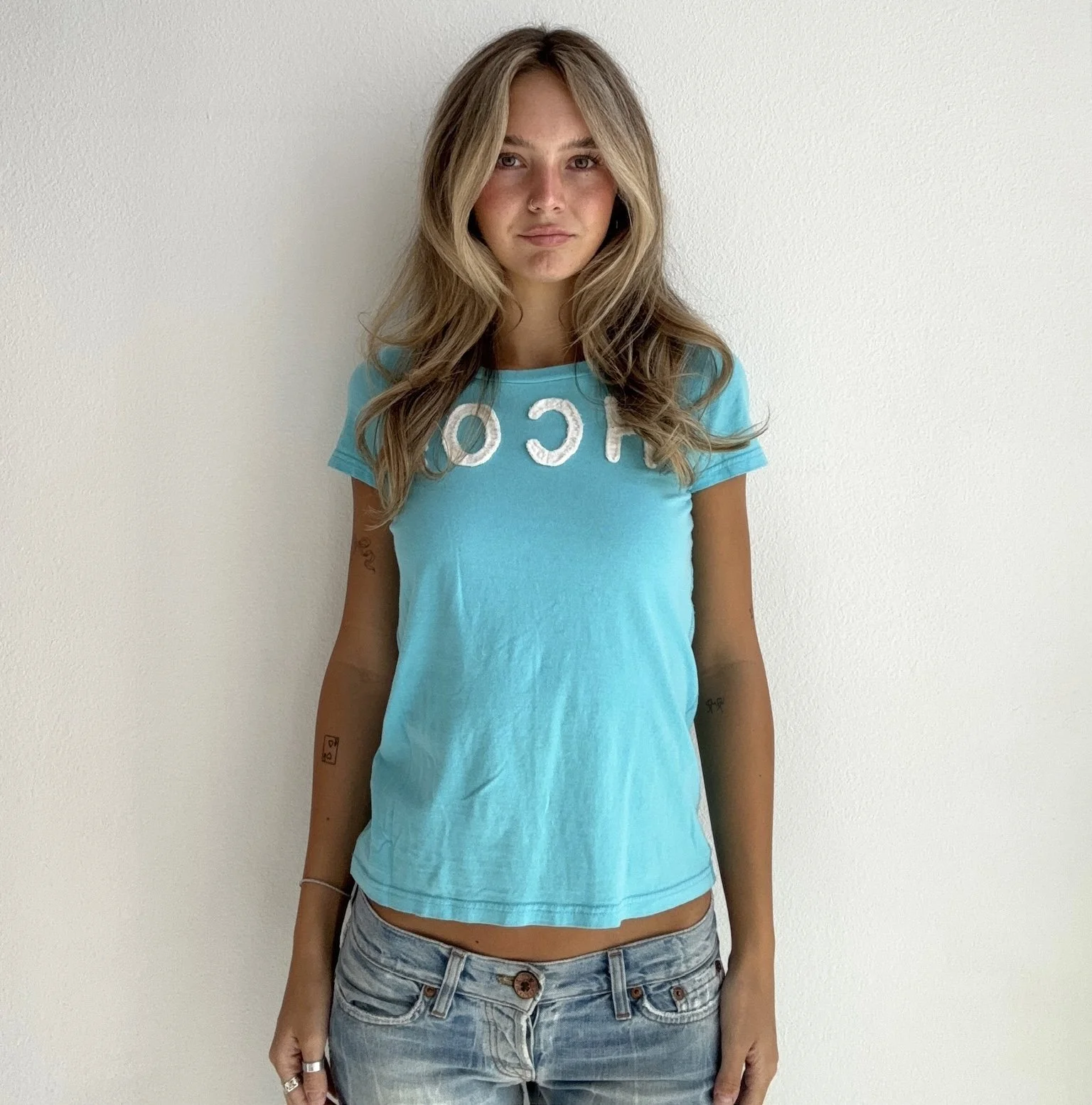 Iconic turquoise baby tee with raised white logo lettering across the front. Soft fitted silhouette with classic short sleeves and major early 2000s energy. The perfect casual staple for your Y2K wardrobe.
