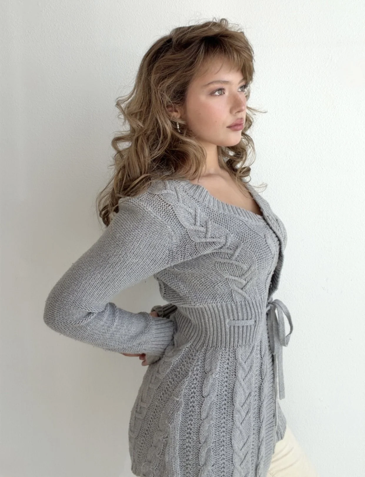 A dreamy Y2K gray cable knit cardigan with a flattering button-front design and adjustable waist tie. Features a soft, cozy knit with classic cable detailing and a slightly fitted silhouette that snatches at the waist while still feeling comfy. Perfect layered or worn on its own for that effortless early-2000s cozy-girl look.