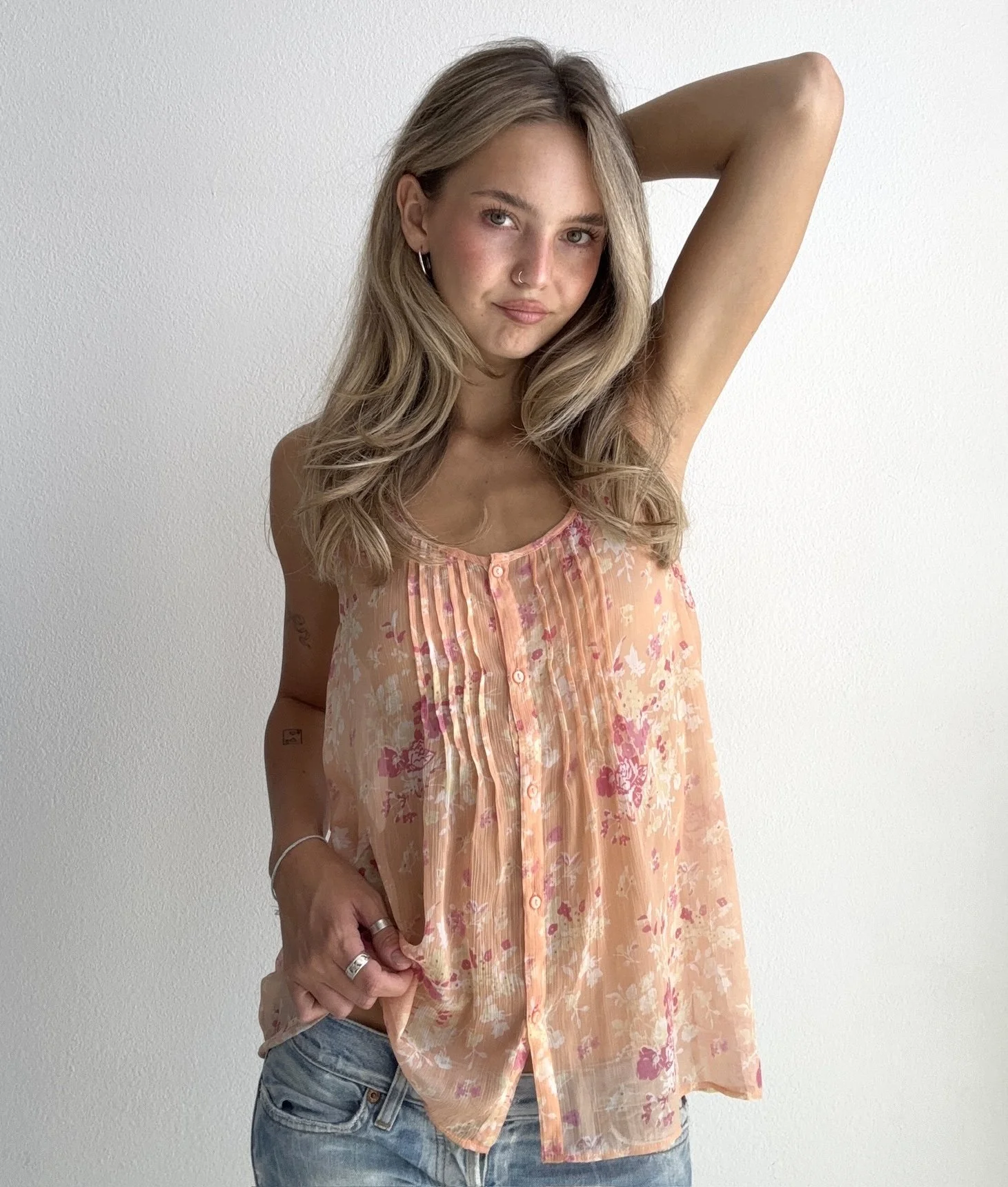 Soft peach sleeveless blouse featuring a delicate floral print, pintuck pleating, and button front detail. Lightweight airy fabric with a sweet romantic silhouette.