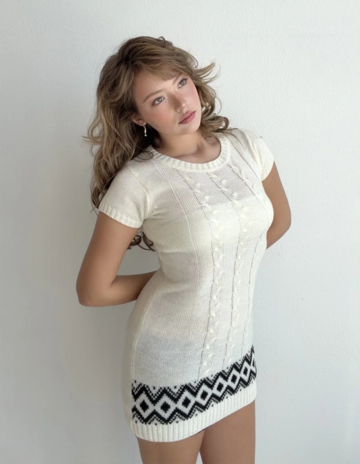 A gorgeous Y2K cream cable knit mini dress with a fitted silhouette and soft stretch. Features classic cable knit detailing throughout with a subtle patterned hem for a cozy yet chic early-2000s look. Perfect styled with boots or layered with a coat for colder months.