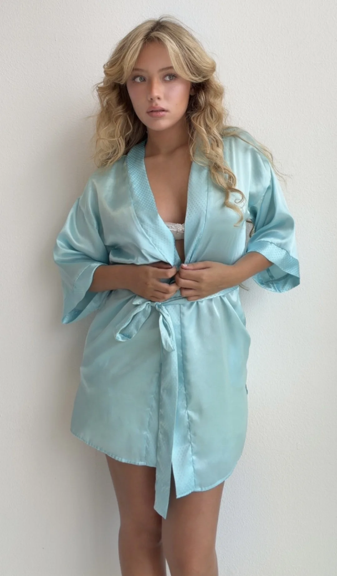 Pretty aqua blue satin robe with a silky lightweight feel and matching waist tie. Features short kimono-style sleeves, a soft open front, and subtle dotted trim detailing. Perfect as a dreamy lounge piece, bridal getting-ready robe, or layered over slips.