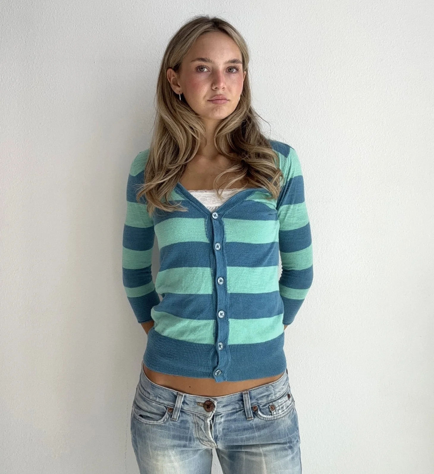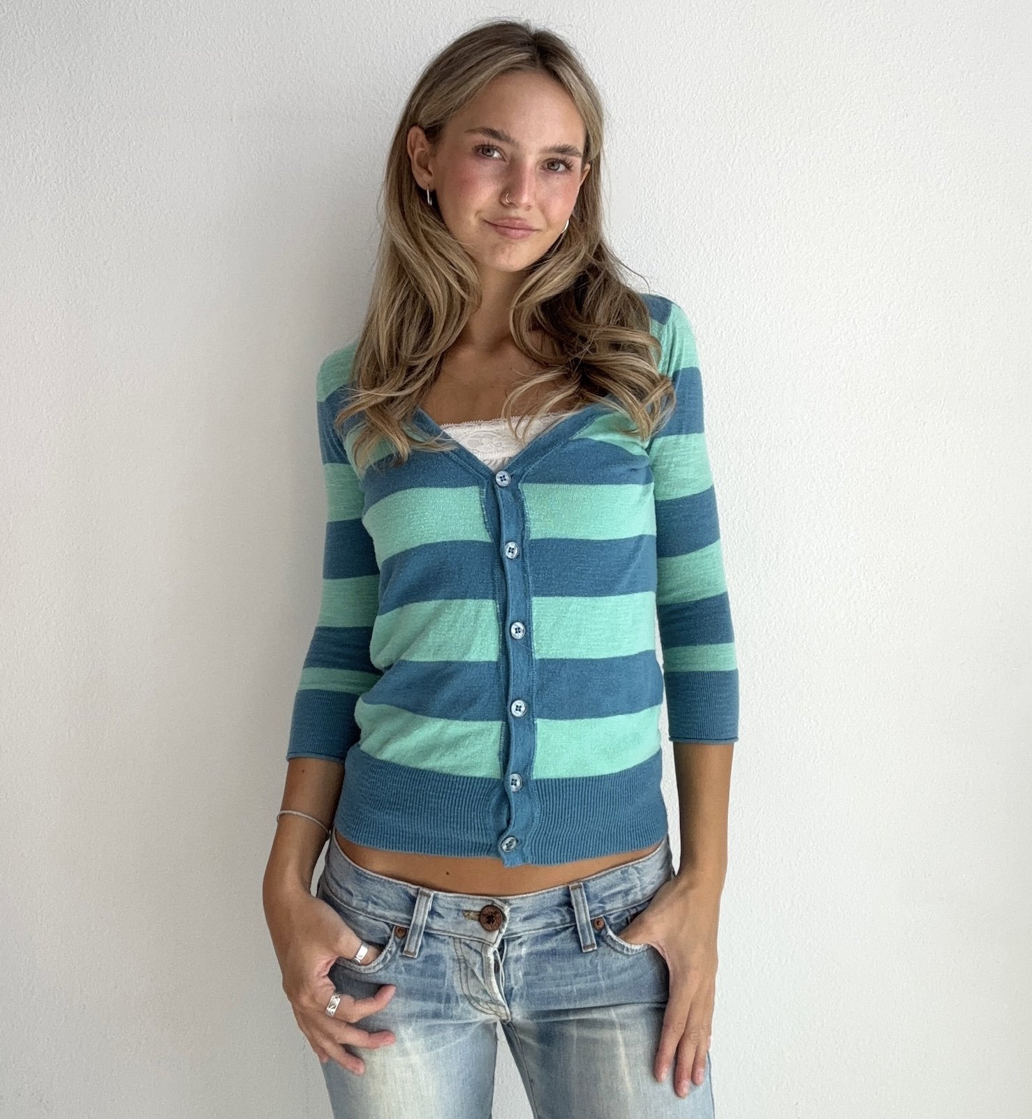 Lightweight knit cardigan featuring bold blue and mint horizontal stripes with a button front design. Soft and fitted with ribbed trim for a flattering vintage-inspired look. Perfect layered or worn on its own.