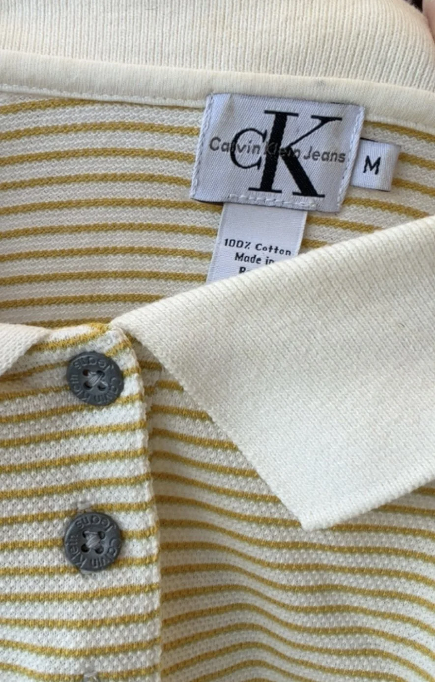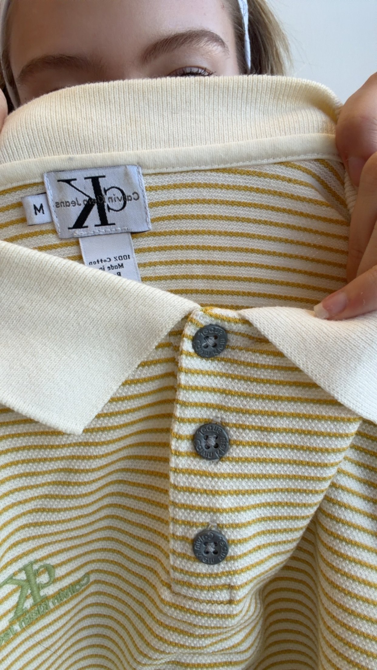 Classic and effortlessly cool with a soft Y2K feel. This vintage Calvin Klein polo features a pale yellow and cream striped pattern with a subtle embroidered logo at the chest. Lightweight with a relaxed fit, making it perfect for everyday wear.