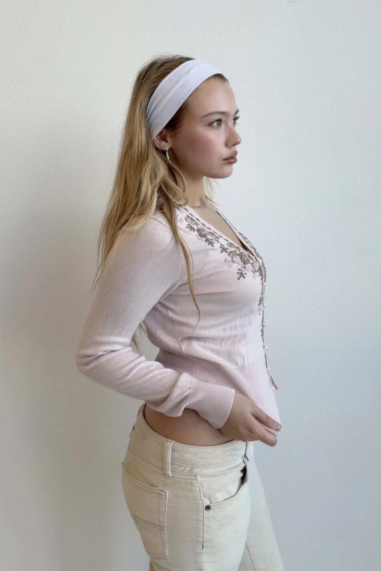 Soft and feminine with the prettiest details. This blush pink cardigan features delicate floral beadwork, a flattering v-neckline, and pearl-style buttons for a romantic vintage feel. Perfect worn on its own or layered over a tank.