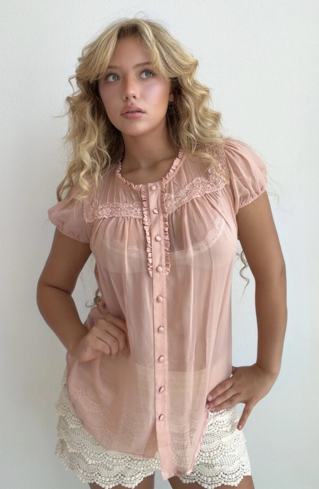 Romantic blush sheer blouse featuring delicate lace trim, puff sleeves, and covered button front closure. Soft and airy with vintage-inspired charm. Perfect layered over a cami or bralette for a dreamy coquette look.