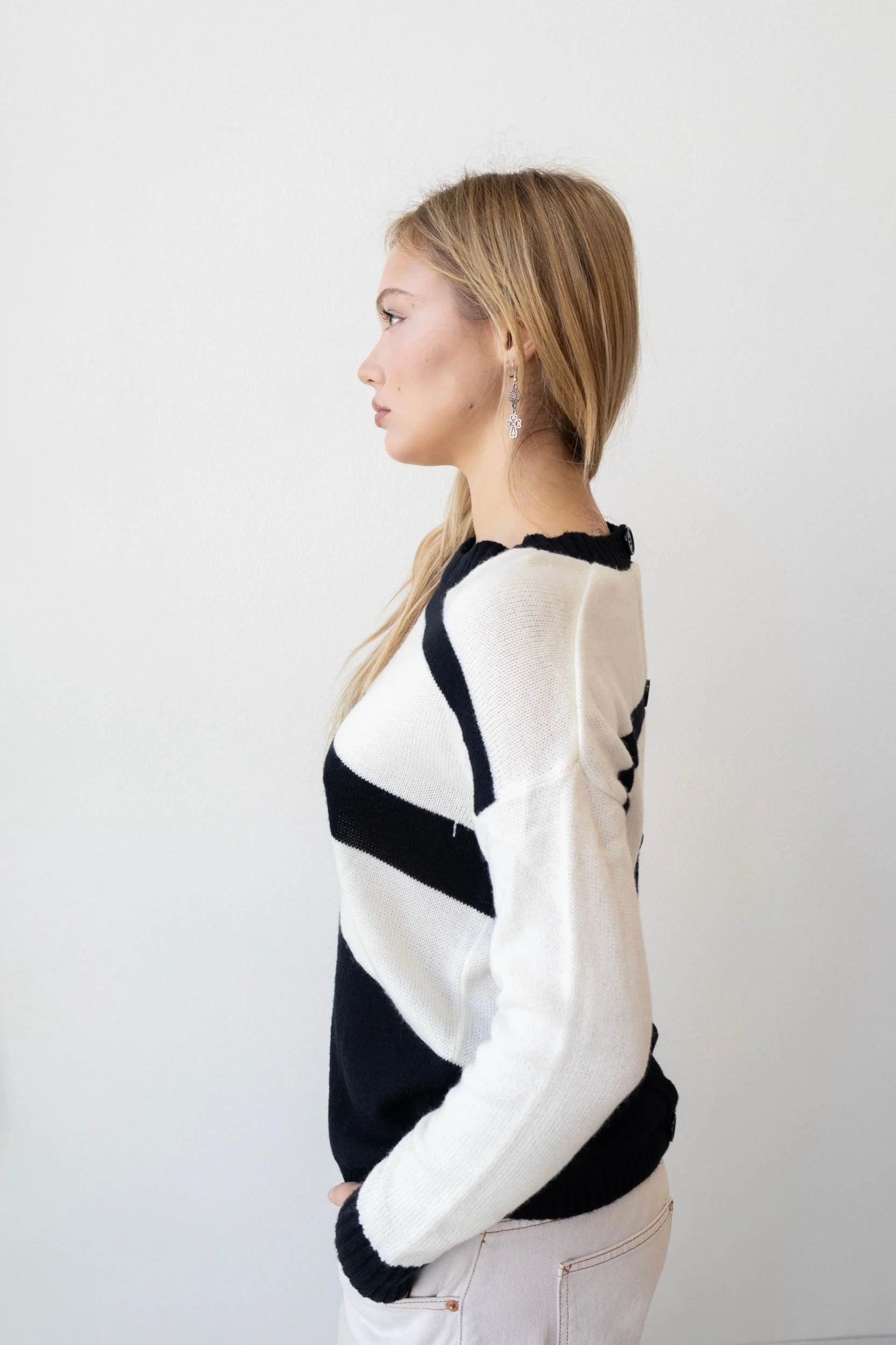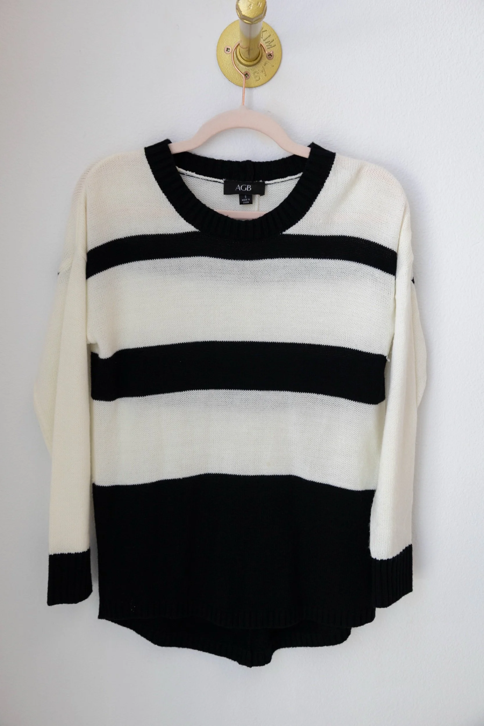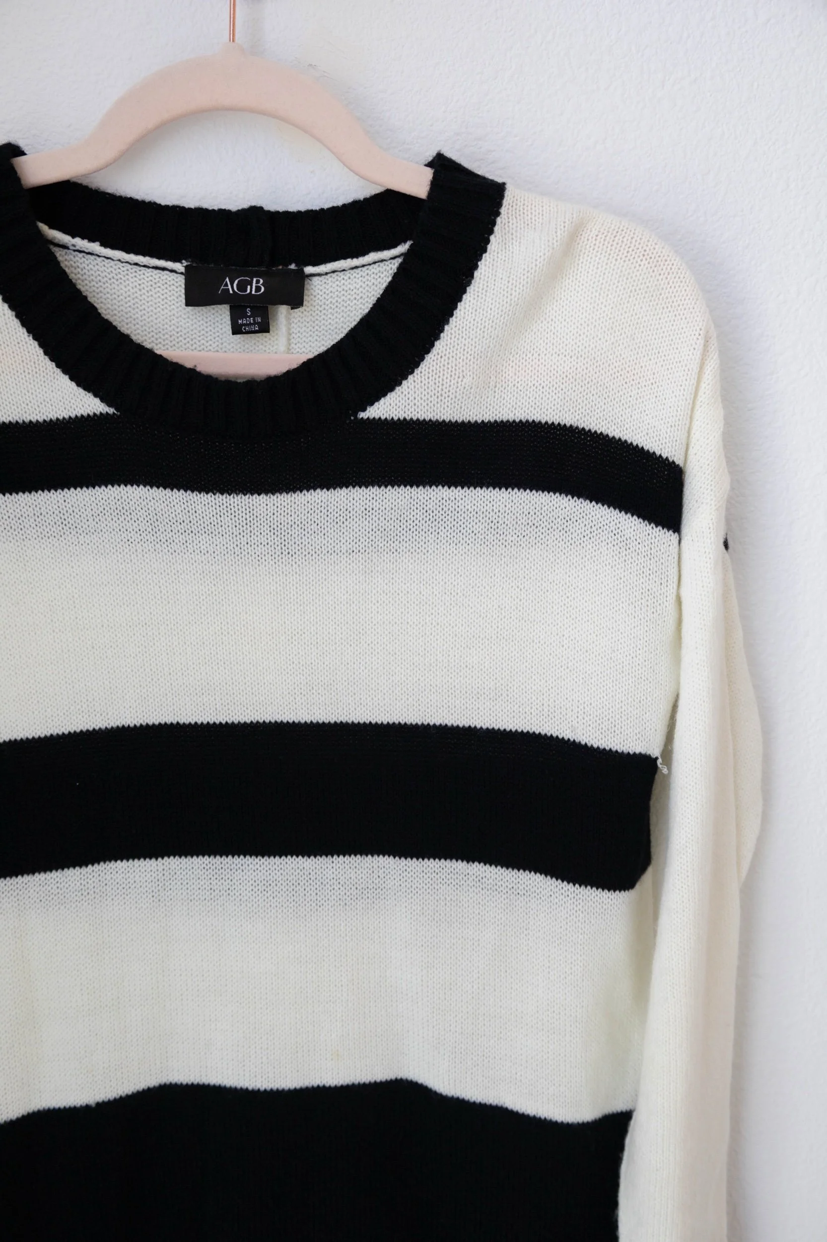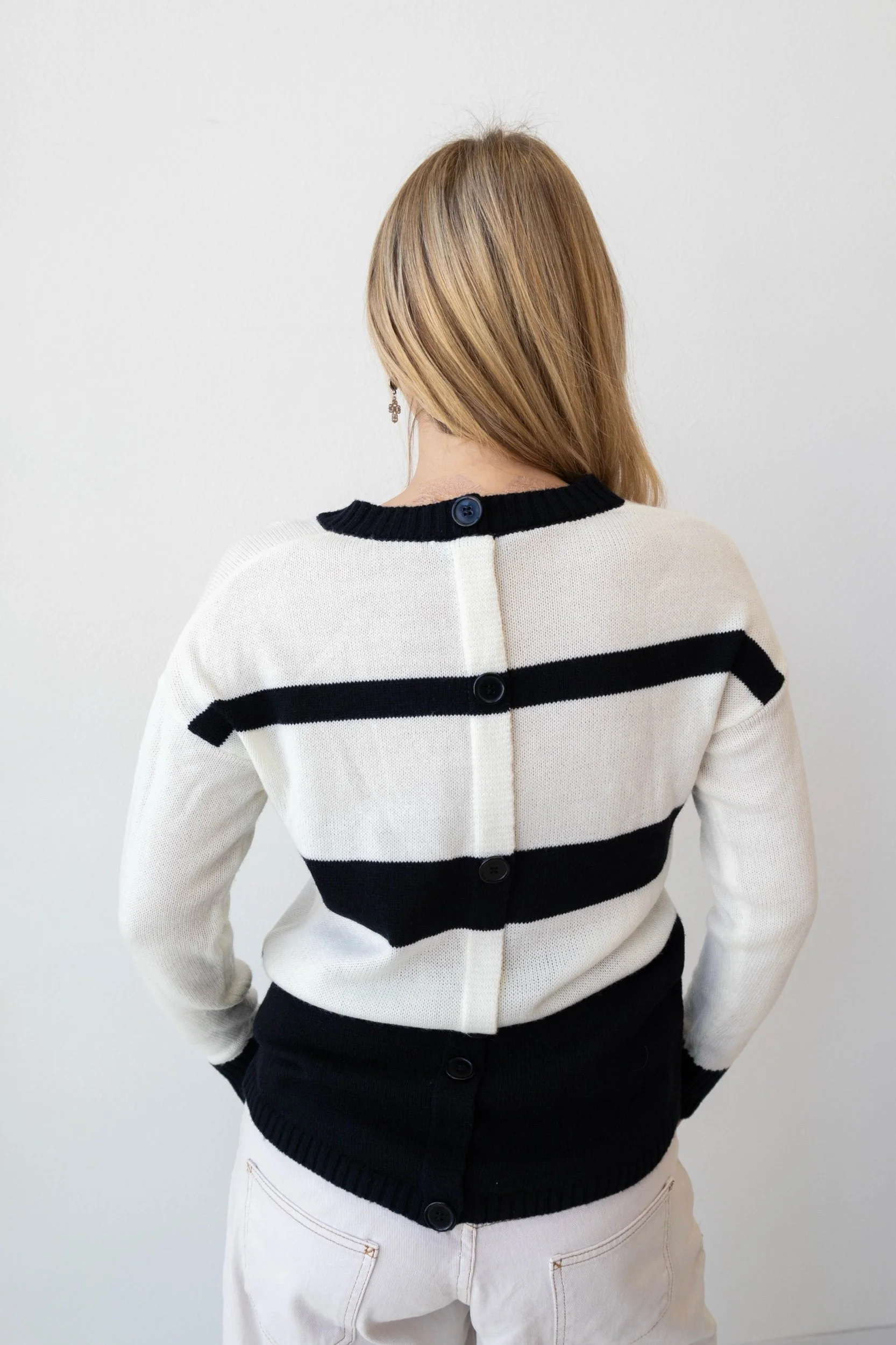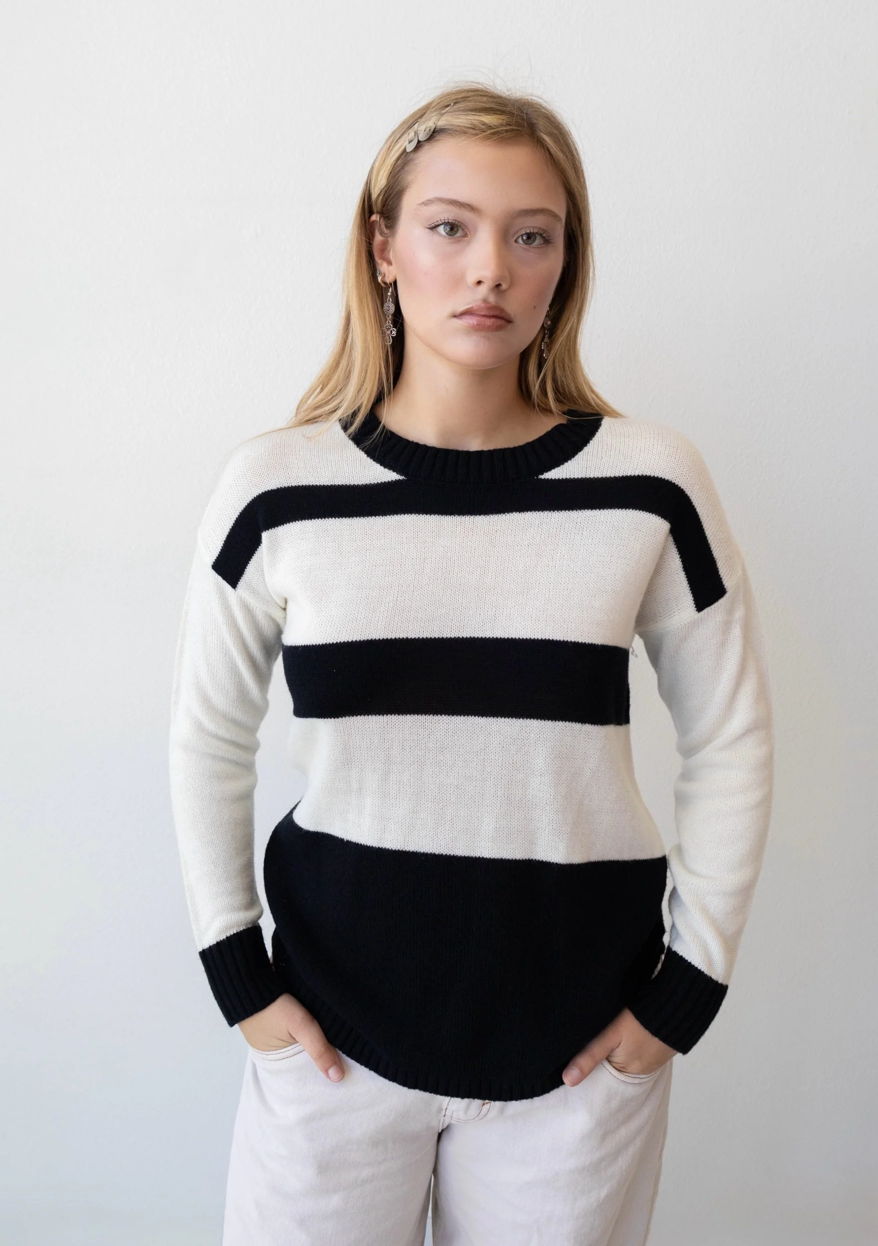 A timeless black and white striped sweater with a soft knit feel and a slightly fitted silhouette. Features bold horizontal stripes and ribbed detailing at the neckline, cuffs, and hem. The perfect balance of cozy and chic — wear it tucked into jeans or layered over a collared shirt for that effortless Parisian-inspired look.