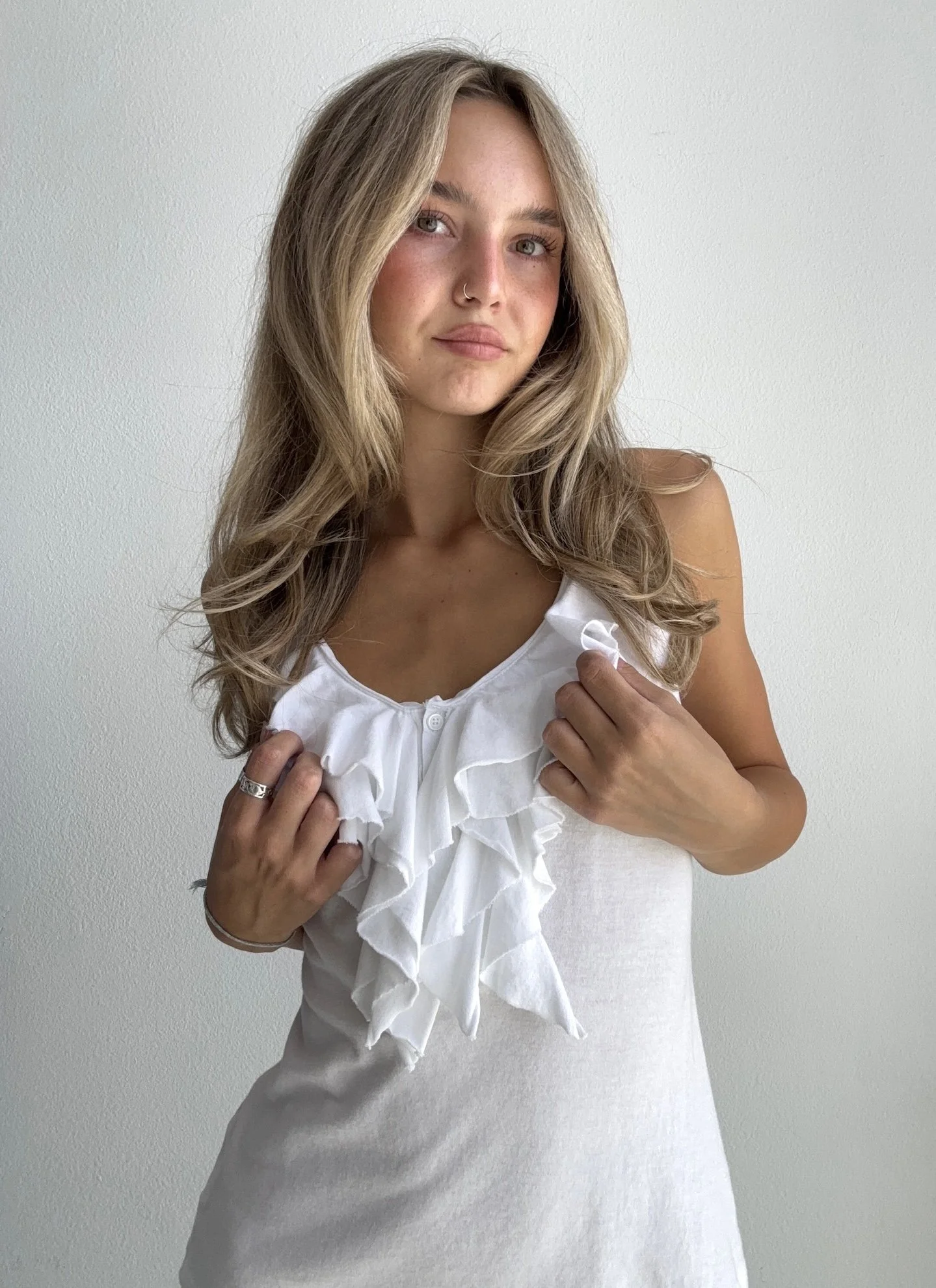 Chic white sleeveless tank featuring dramatic cascading ruffles down the front with a flattering scoop neckline. Soft and feminine statement basic.