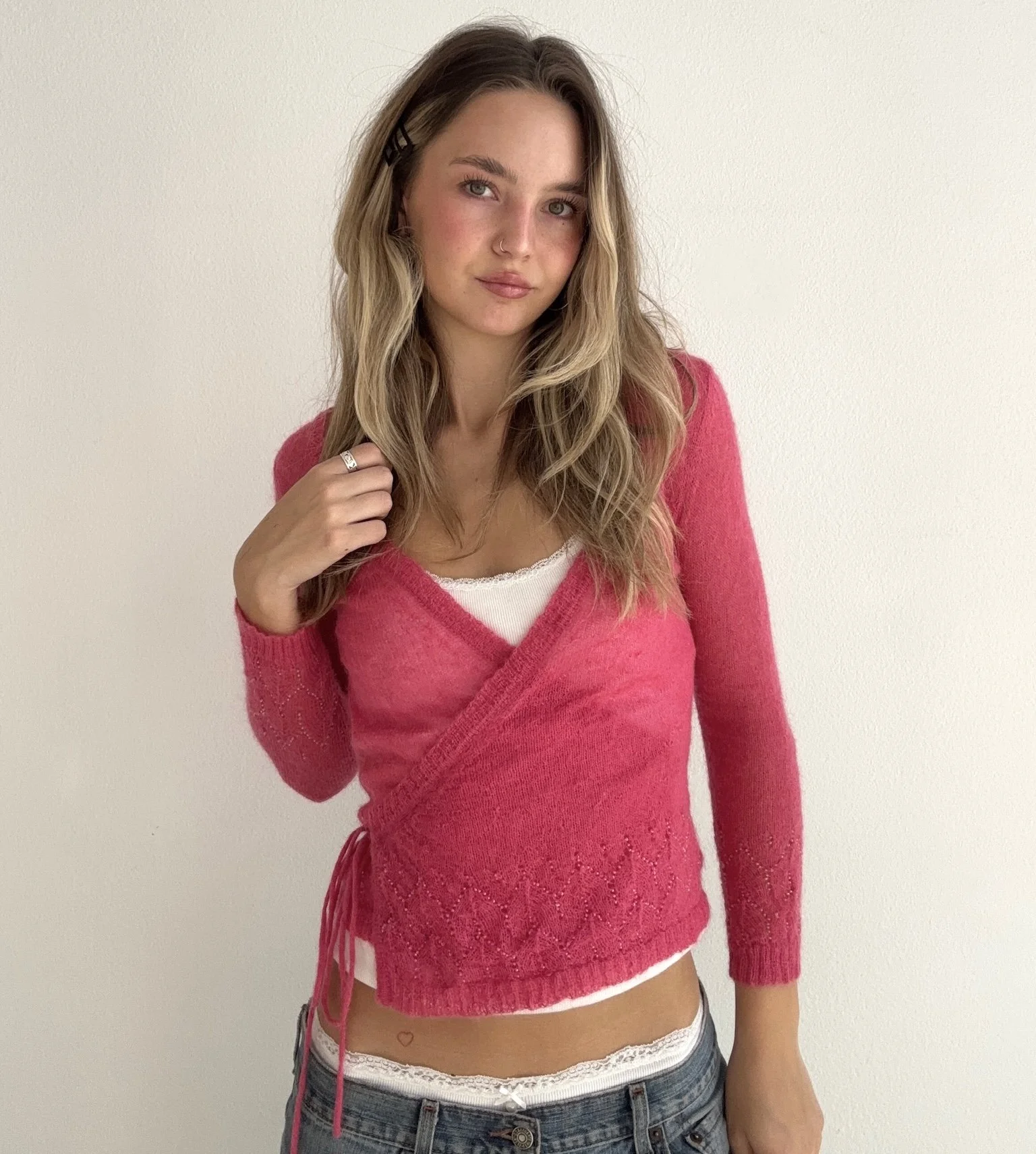 The CUTEST vibrant pink wrap sweater.