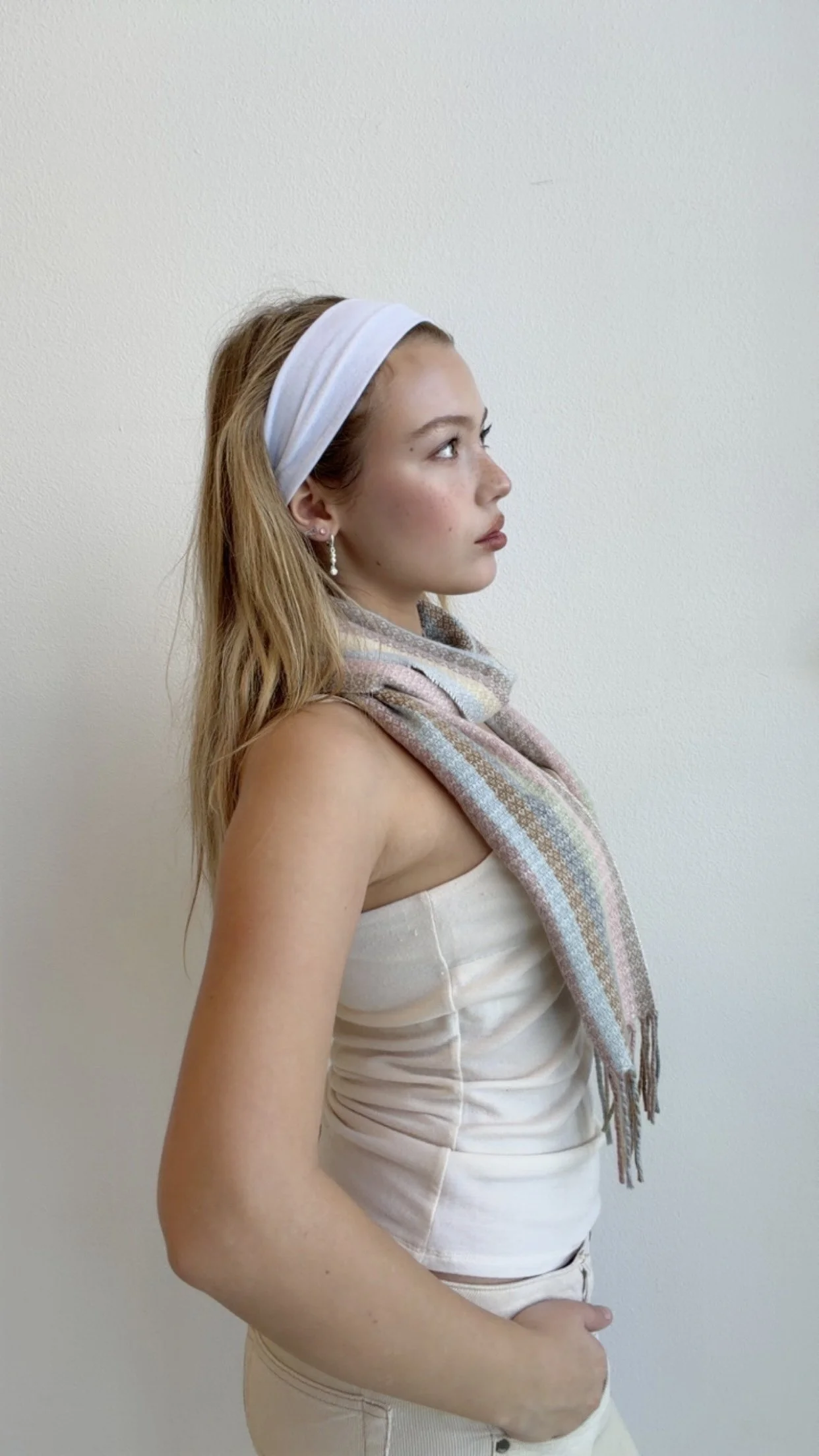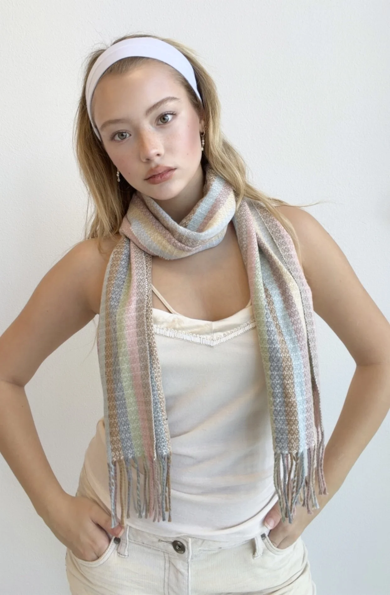 A soft pastel striped scarf with delicate woven texture and subtle fringe edges. Features muted shades of pink, blue, green, and beige for a romantic, vintage look. Lightweight yet cozy — perfect for transitional seasons or soft layering.