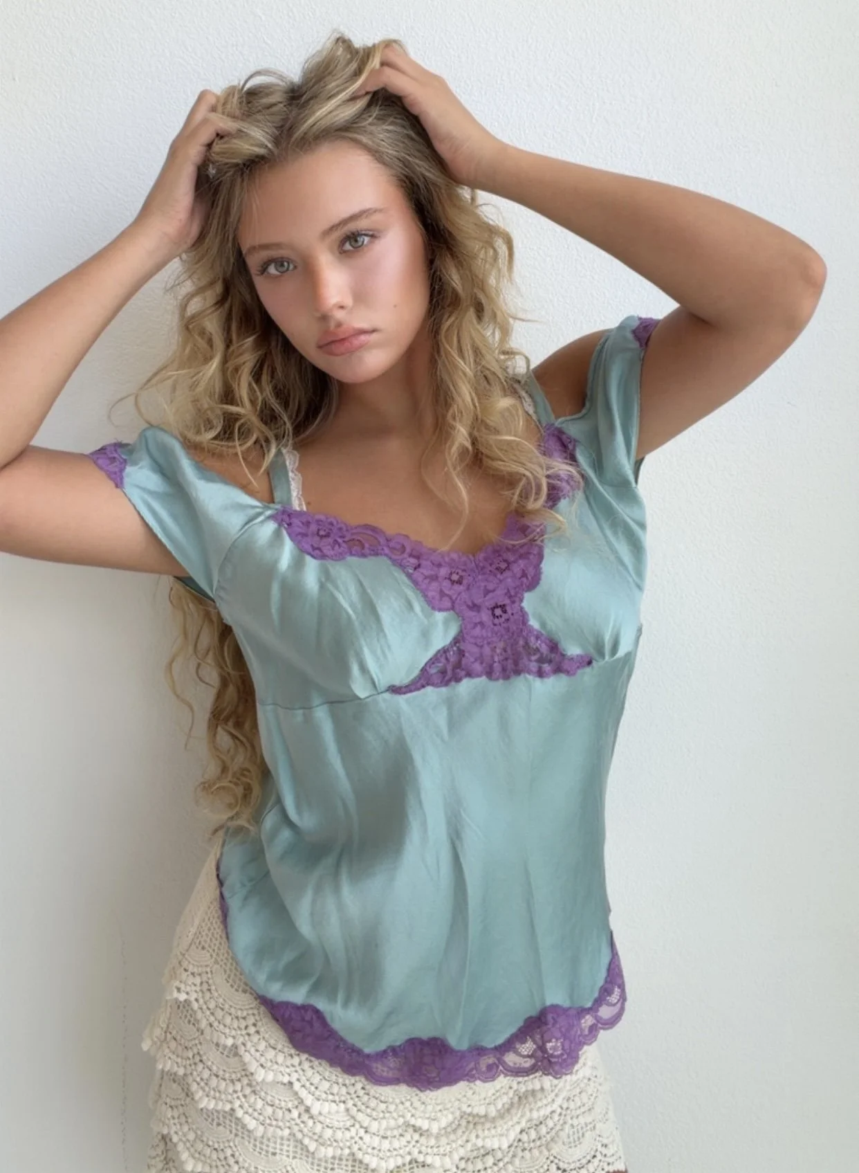Dreamy aqua satin-feel top featuring rich violet lace trim and floral appliqué detailing. A rare statement piece with whimsical fairy energy.