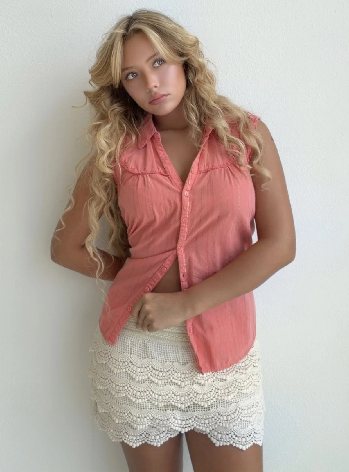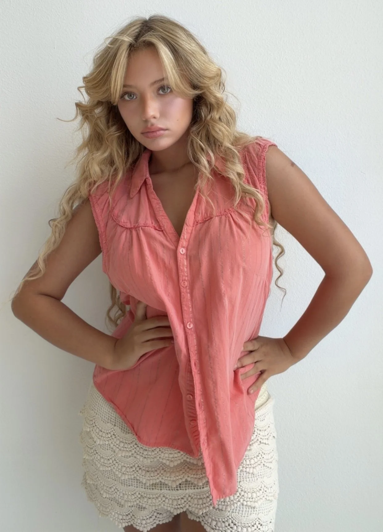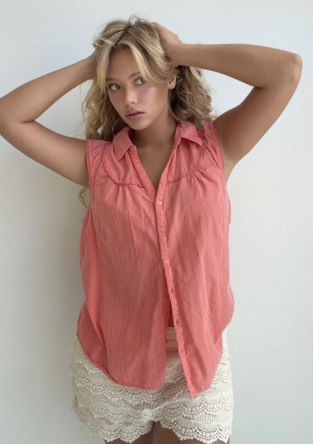 Pretty coral sleeveless blouse featuring subtle vertical shimmer stripes, button front closure, and soft gathered chest details. Lightweight and flattering with a feminine vintage feel.