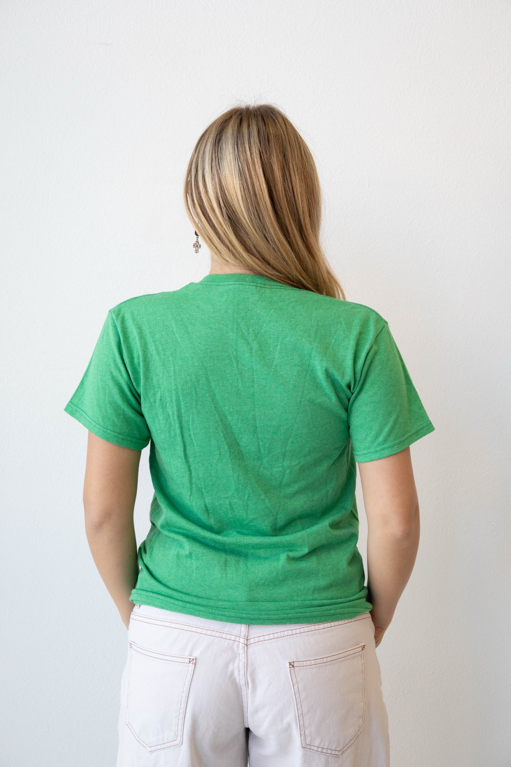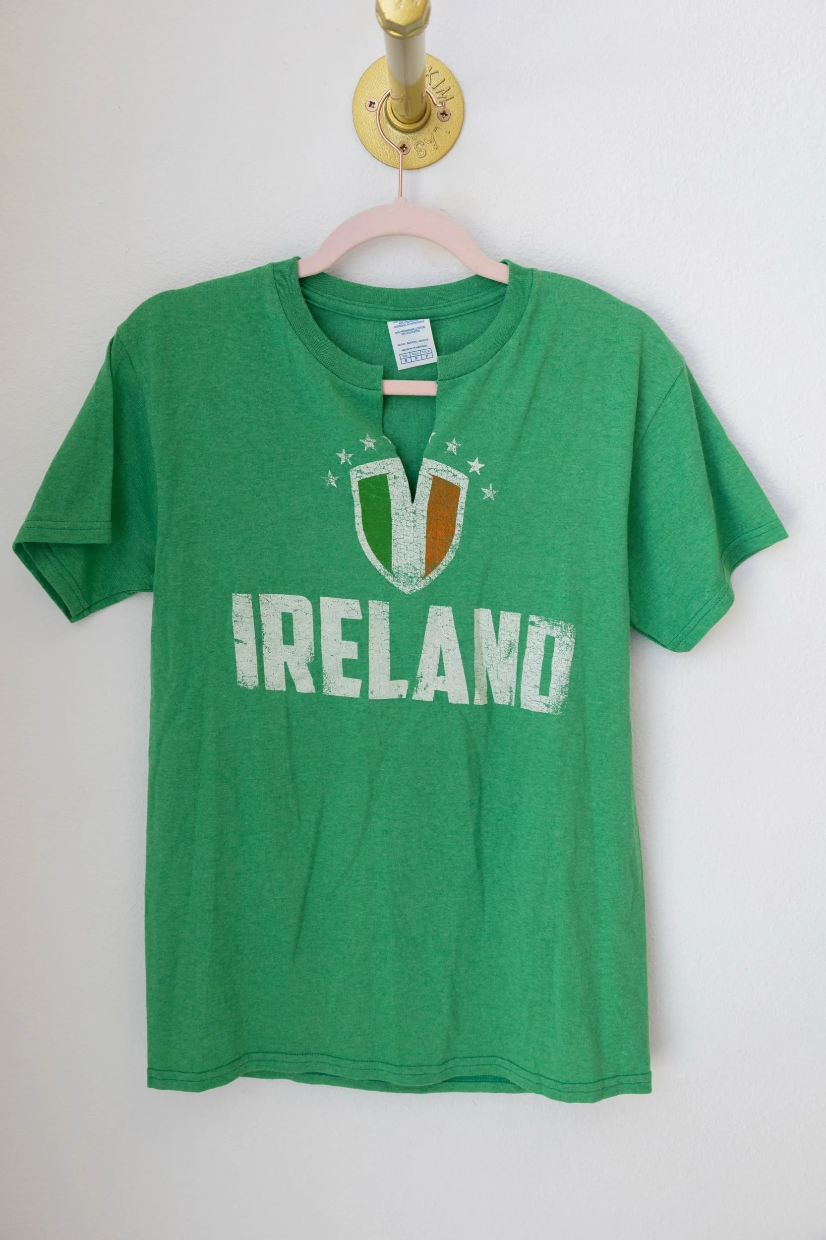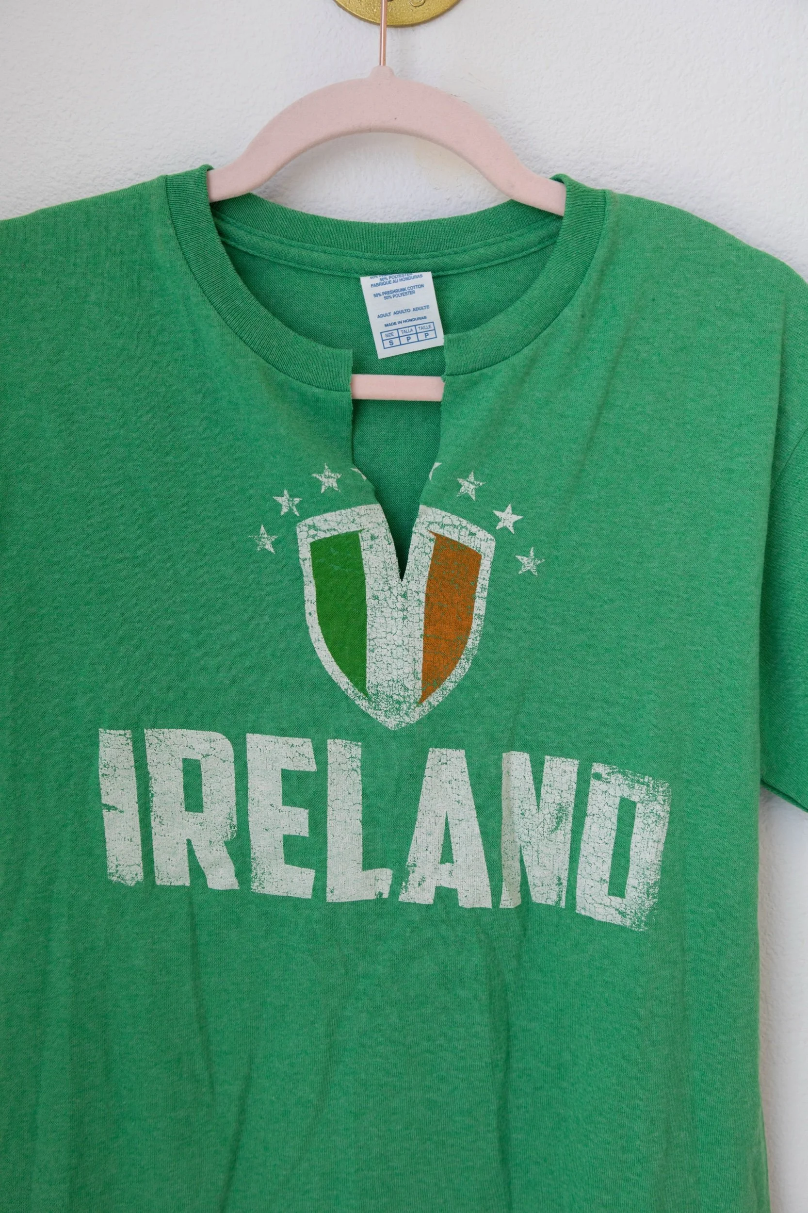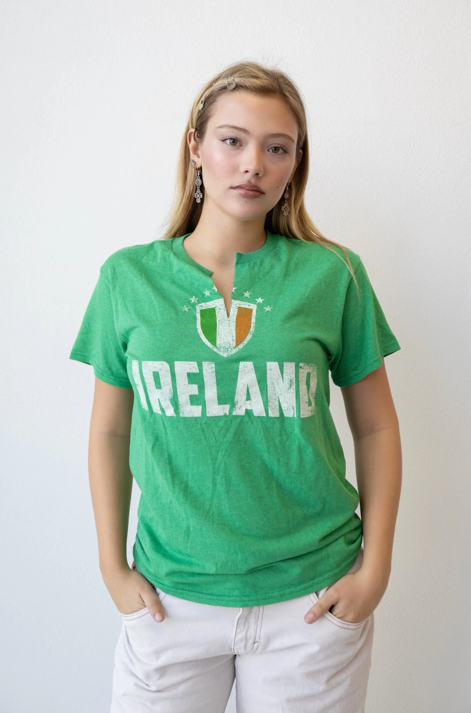 A soft, worn-in vintage graphic tee in vibrant emerald green featuring a bold "Ireland" print and crest design. The lightweight cotton fabric has the perfect lived-in feel, complete with a flattering raw-cut neckline for that effortless, laid-back look. Style it tucked into jeans or layered under a jacket for cozy, cool-girl charm.