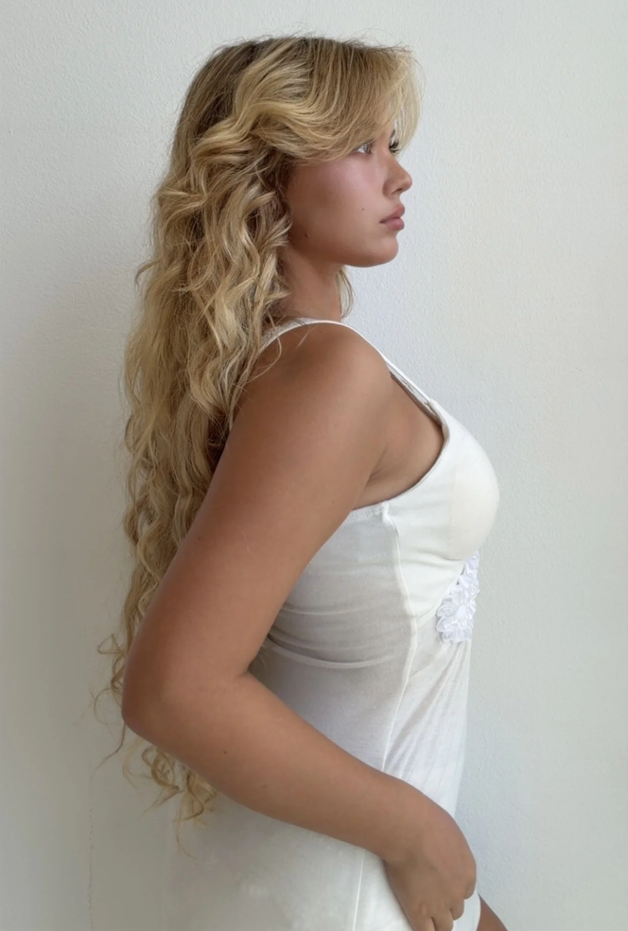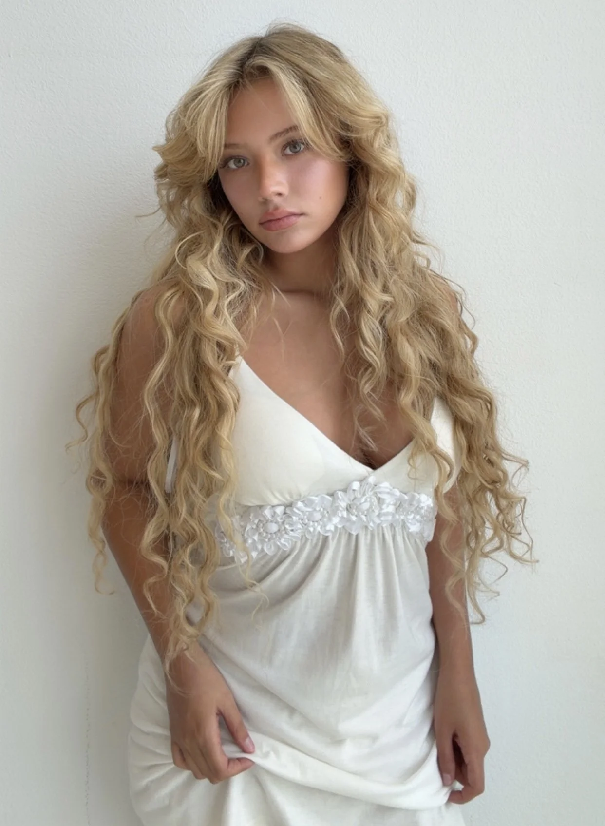 Soft ivory tank with a flattering empire waist and delicate 3D floral appliqué detail across the bust. Stretchy and feminine with a romantic early 2000s feel.