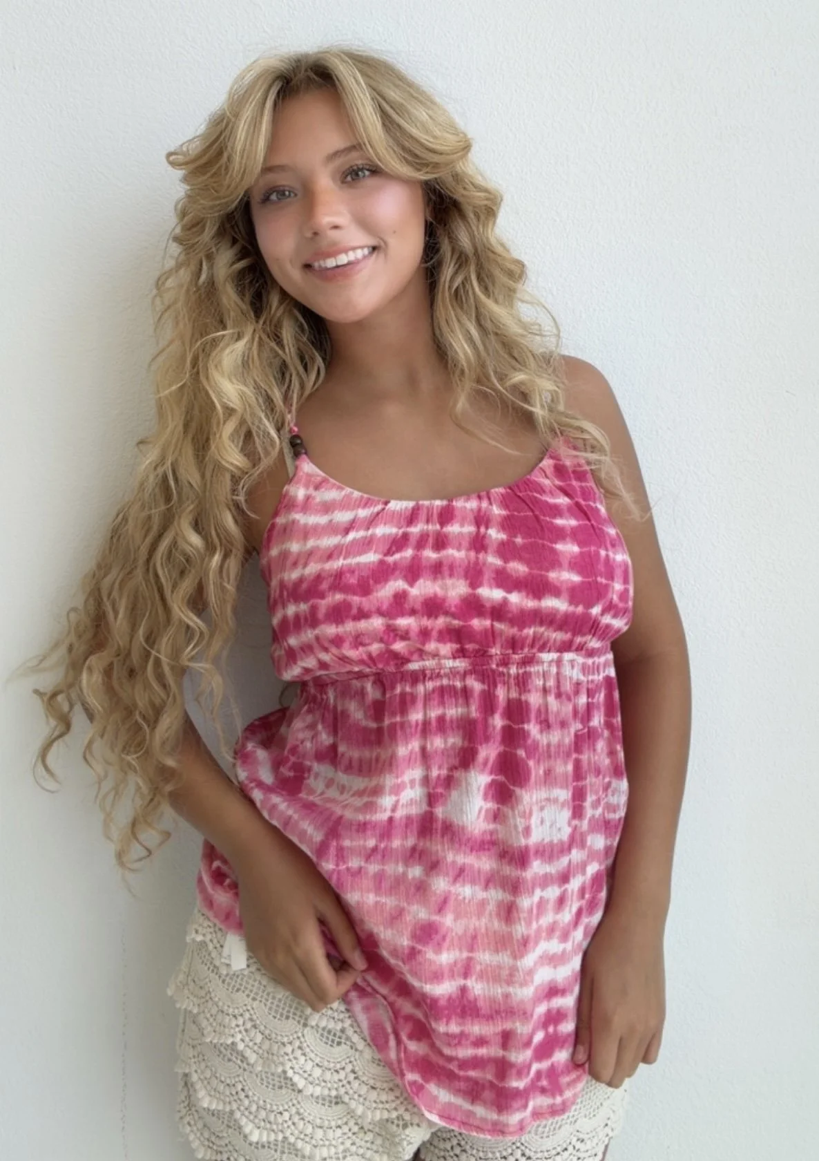 Bright pink tie dye tank with a flattering babydoll silhouette and breezy lightweight fit. The cutest throw-on top for beach days, festivals, or summer errands.